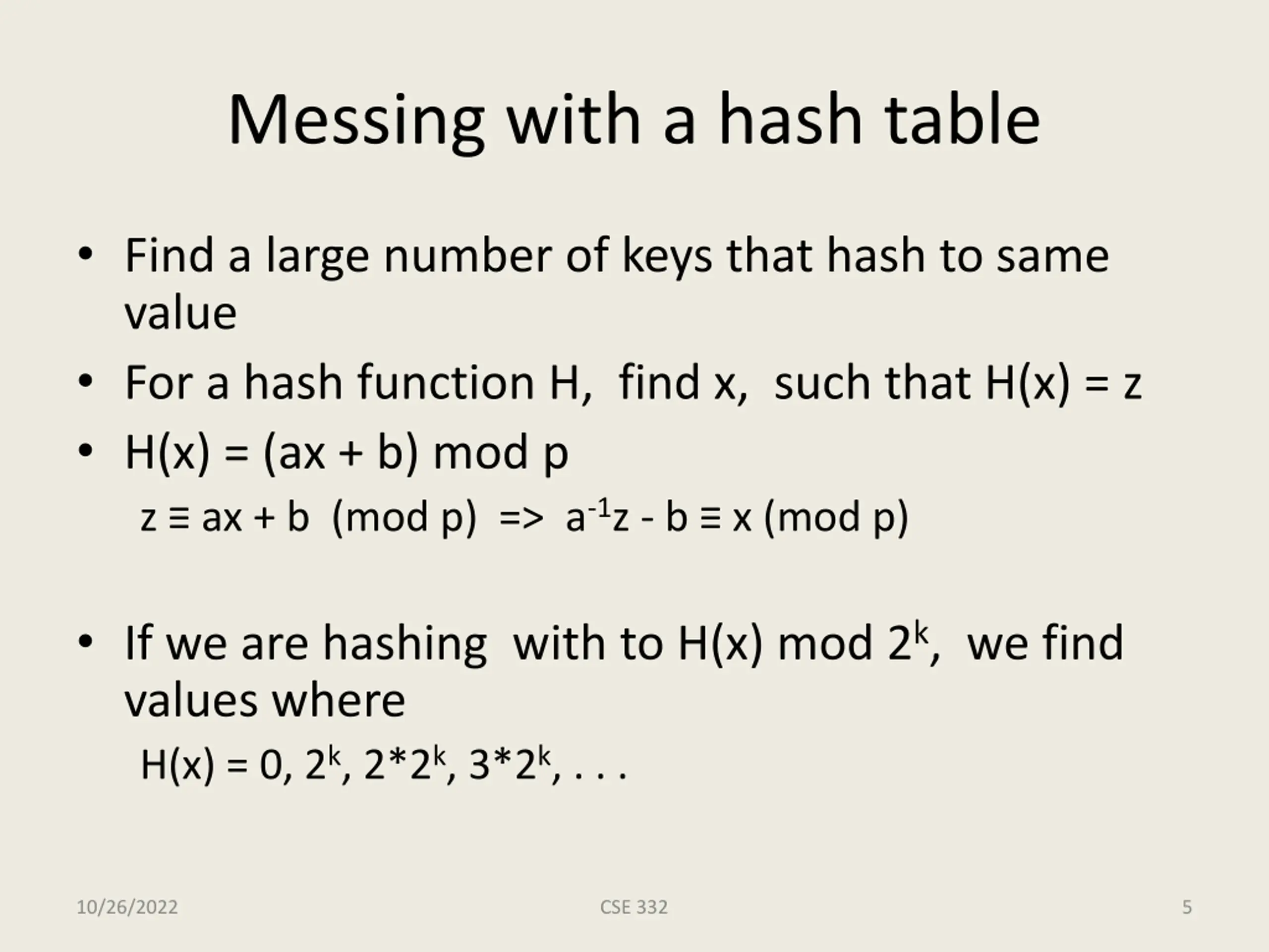 Messing with a hash table Find a large number of keys that hash to same value For a hash function H, find x, such that H(x) = z H(x) = (ax + b) mod p z ax + b (mod p) => a-1z - b x (mod p) If we are hashing with to H(x) mod 2k, we find values where H(x) = 0, 2k, 2*2k, 3*2k, . . . 10/26/2022 CSE 332 5