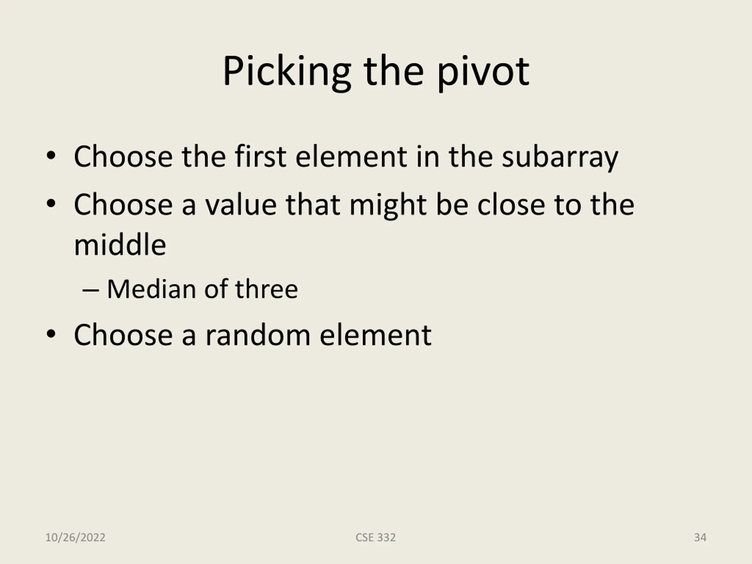 Picking the pivot Choose the first element in the subarray Choose a value that might be close to the middle Median of three Choose a random element 10/26/2022 CSE 332 34