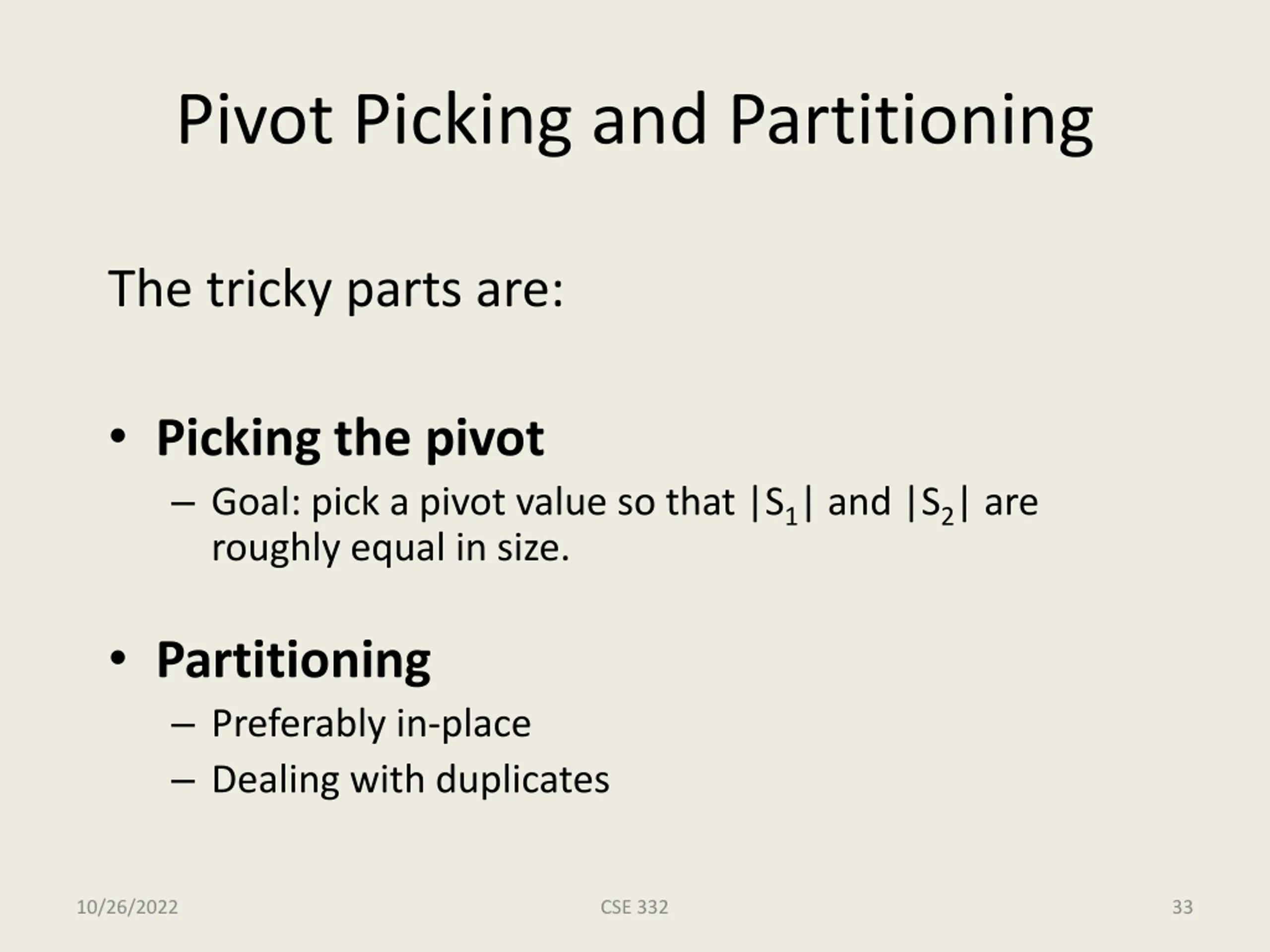 Pivot Picking and Partitioning The tricky parts are: Picking the pivot Goal: pick a pivot value so that |S1| and |S2| are roughly equal in size. Partitioning Preferably in-place Dealing with duplicates 10/26/2022 CSE 332 33
