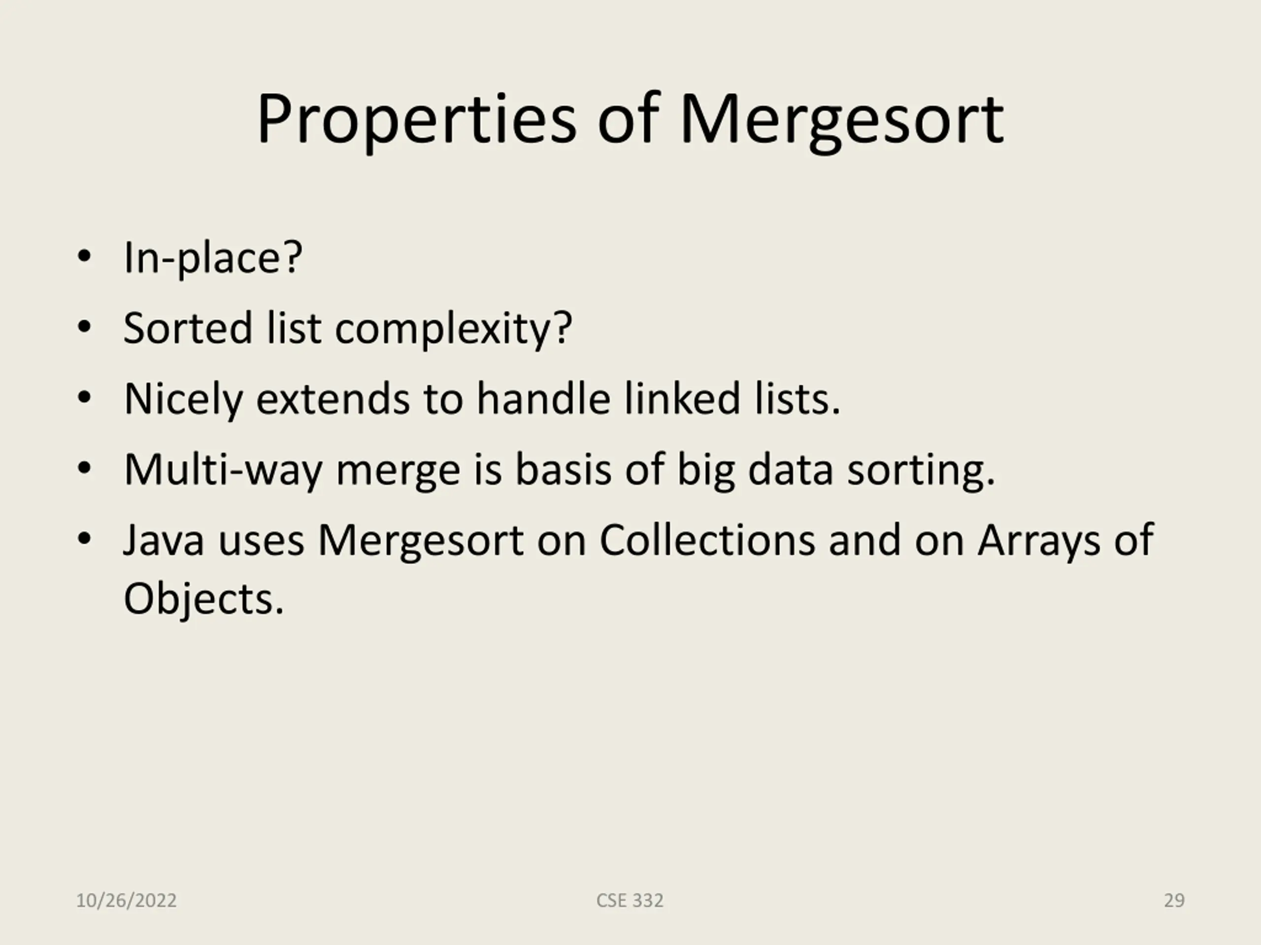 Properties of Mergesort In-place? Sorted list complexity? Nicely extends to handle linked lists. Multi-way merge is basis of big data sorting. Java uses Mergesort on Collections and on Arrays of Objects. 10/26/2022 CSE 332 29