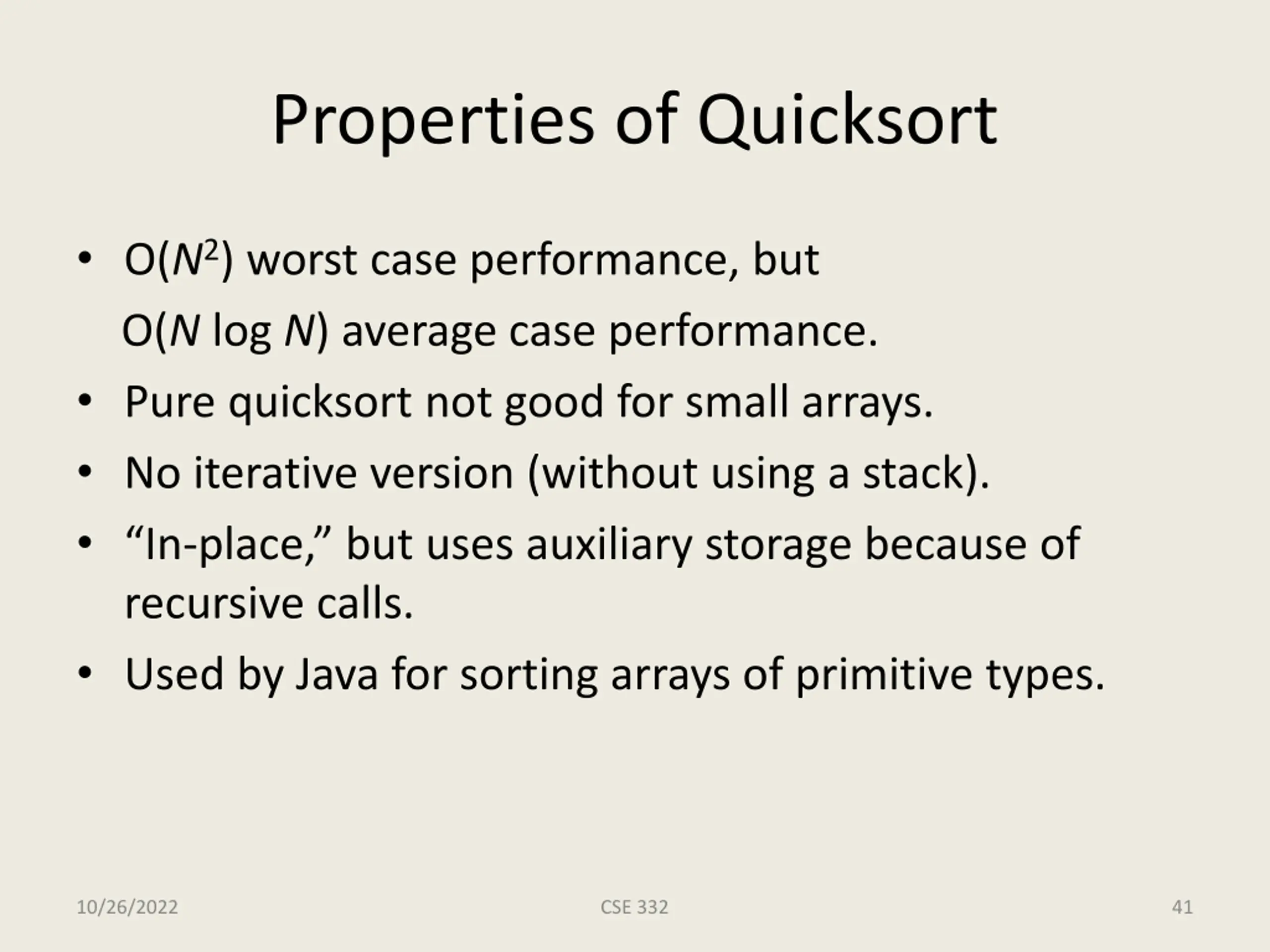 Properties of Quicksort O(N2) worst case performance, but O(N log N) average case performance. Pure quicksort not good for small arrays. No iterative version (without using a stack). In-place, but uses auxiliary storage because of recursive calls. Used by Java for sorting arrays of primitive types. 10/26/2022 CSE 332 41