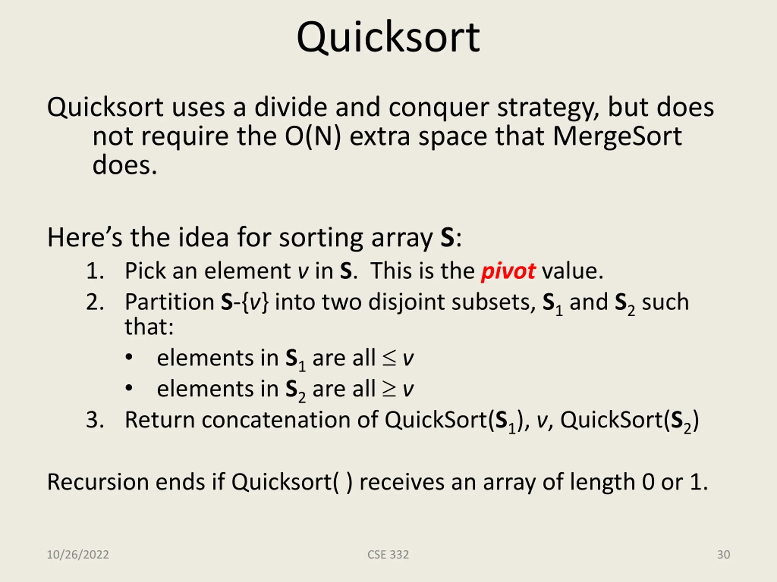 Quicksort Quicksort uses a divide and conquer strategy, but does not require the O(N) extra space that MergeSort does. Here s the idea for sorting array S: 1. Pick an element v in S. This is the pivot value. 2. Partition S-{v} into two disjoint subsets, S1 and S2 such that: elements in S1 are all v elements in S2 are all v 3. Return concatenation of QuickSort(S1), v, QuickSort(S2) Recursion ends if Quicksort( ) receives an array of length 0 or 1. 10/26/2022 CSE 332 30