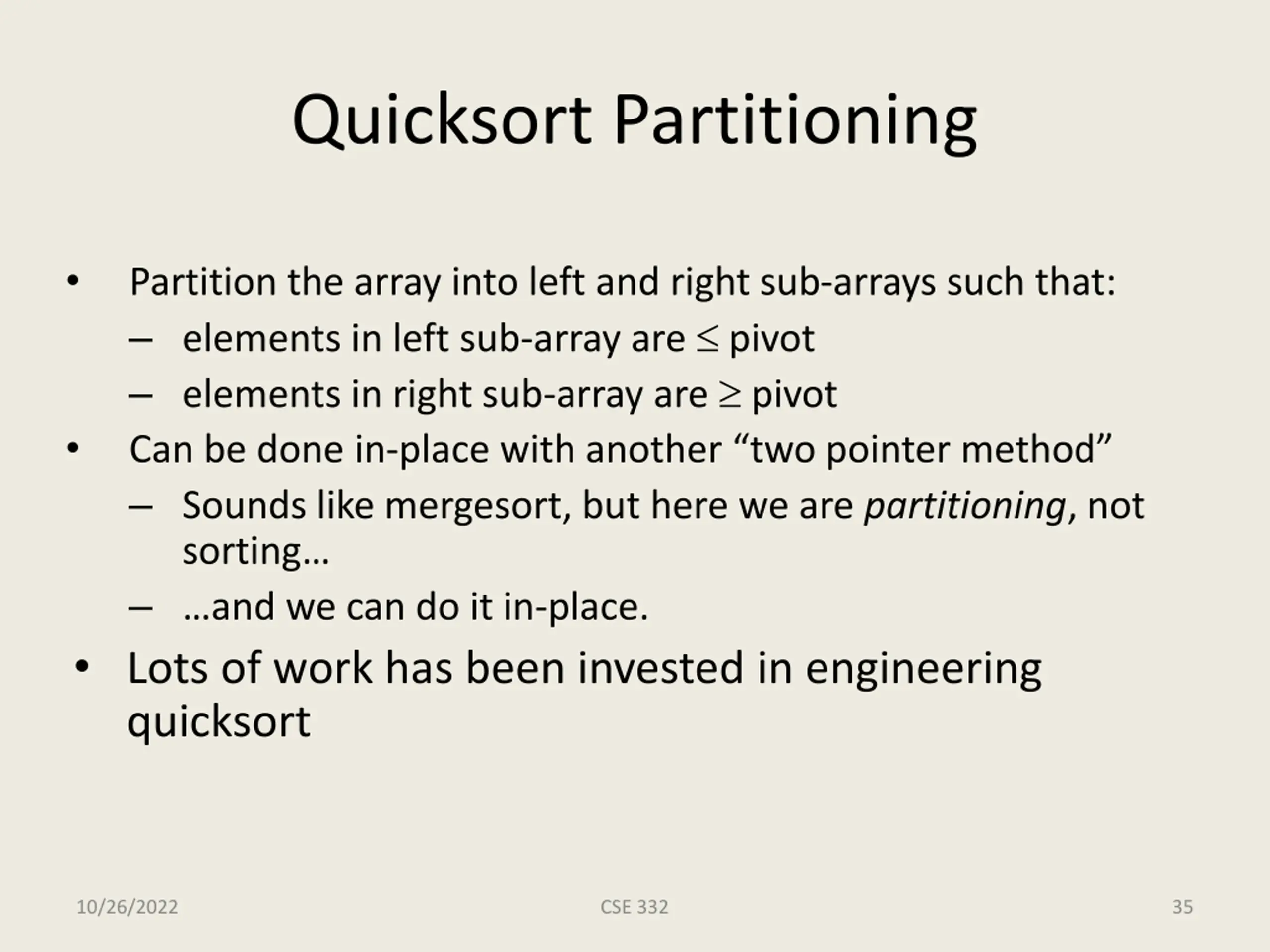 Quicksort Partitioning Partition the array into left and right sub-arrays such that: elements in left sub-array are pivot elements in right sub-array are pivot Can be done in-place with another two pointer method Sounds like mergesort, but here we are partitioning, not sorting and we can do it in-place. Lots of work has been invested in engineering quicksort 10/26/2022 CSE 332 35