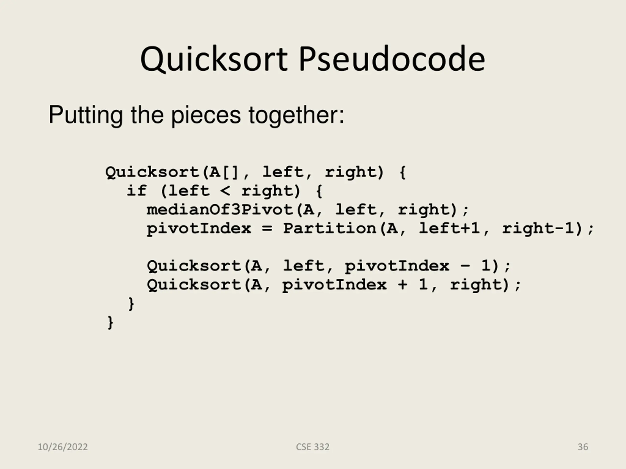 Quicksort Pseudocode Putting the pieces together: Quicksort(A[], left, right) { if (left < right) { medianOf3Pivot(A, left, right); pivotIndex = Partition(A, left+1, right-1); Quicksort(A, left, pivotIndex 1); Quicksort(A, pivotIndex + 1, right); } } 10/26/2022 CSE 332 36