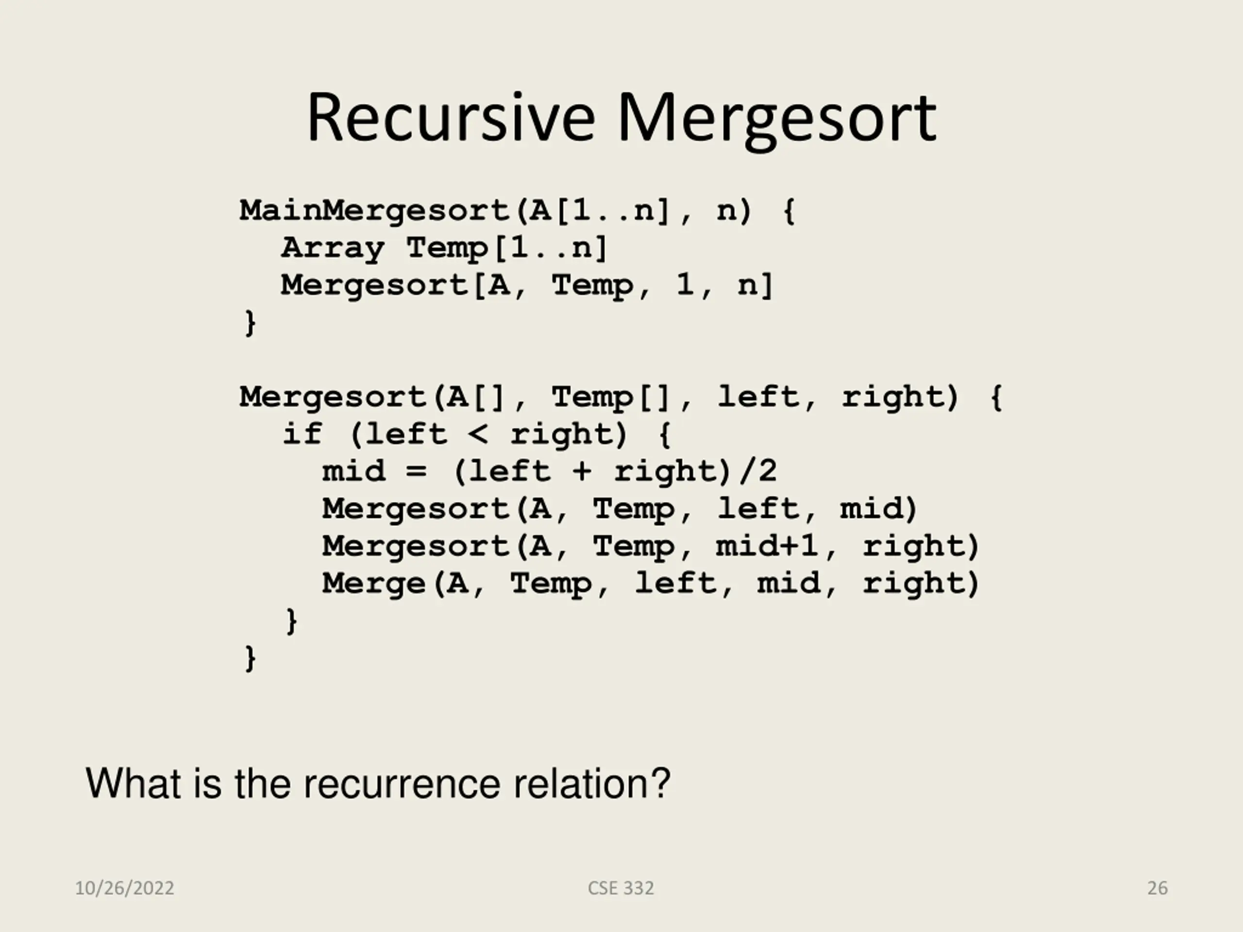 Recursive Mergesort MainMergesort(A[1..n], n) { Array Temp[1..n] Mergesort[A, Temp, 1, n] } Mergesort(A[], Temp[], left, right) { if (left < right) { mid = (left + right)/2 Mergesort(A, Temp, left, mid) Mergesort(A, Temp, mid+1, right) Merge(A, Temp, left, mid, right) } } What is the recurrence relation? 10/26/2022 CSE 332 26