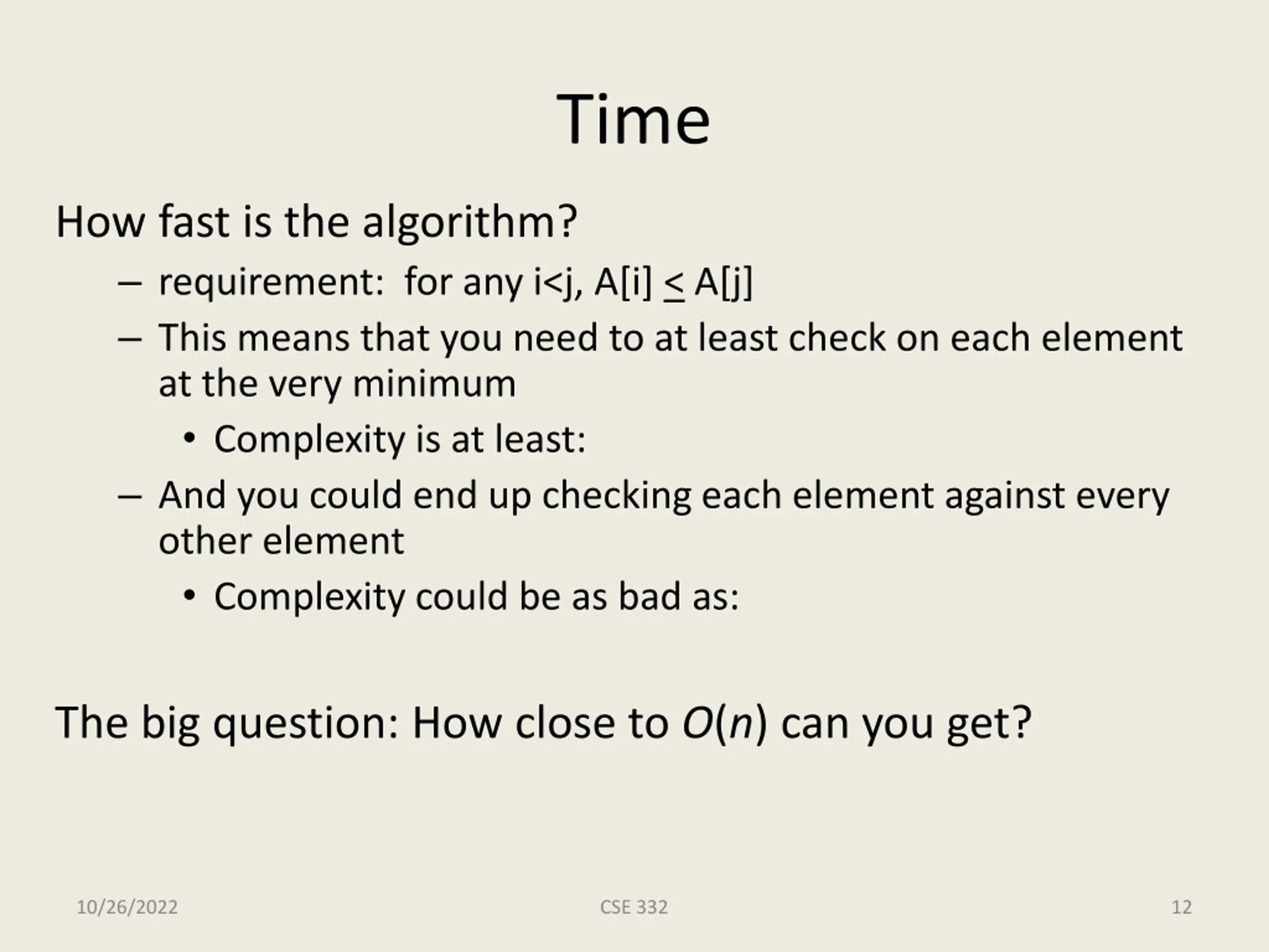 Time How fast is the algorithm? requirement: for any i<j, A[i] < A[j] This means that you need to at least check on each element at the very minimum Complexity is at least: And you could end up checking each element against every other element Complexity could be as bad as: The big question: How close to O(n) can you get? 10/26/2022 CSE 332 12