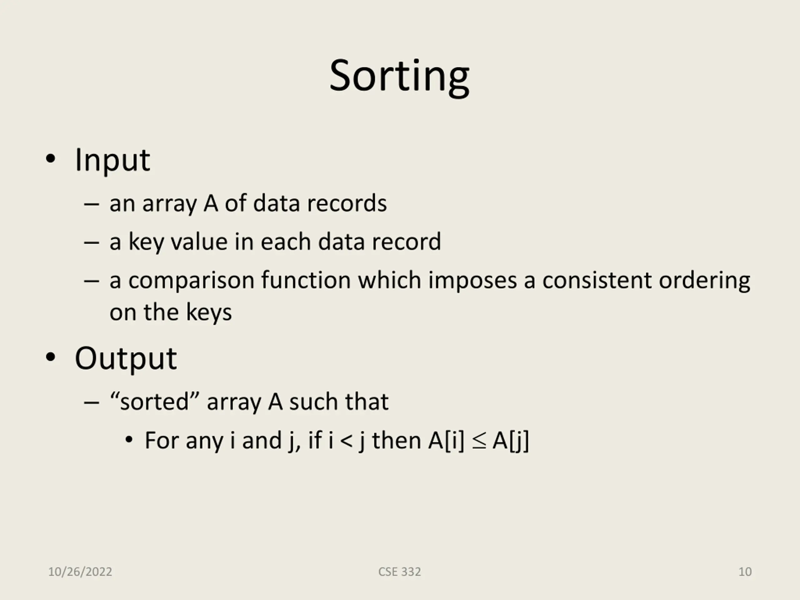 Sorting Input an array A of data records a key value in each data record a comparison function which imposes a consistent ordering on the keys Output sorted array A such that For any i and j, if i < j then A[i] A[j] 10/26/2022 CSE 332 10