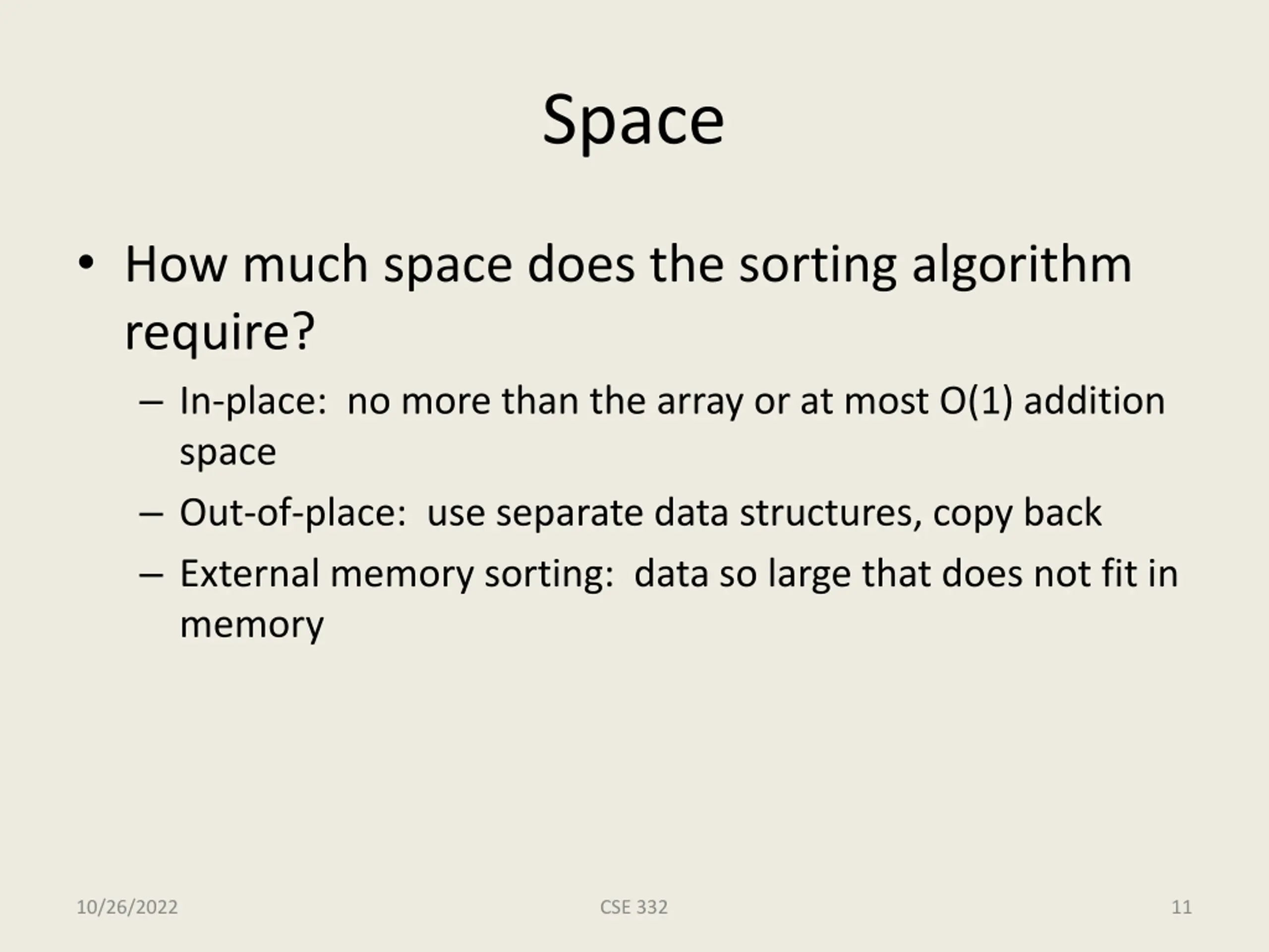 Space How much space does the sorting algorithm require? In-place: no more than the array or at most O(1) addition space Out-of-place: use separate data structures, copy back External memory sorting: data so large that does not fit in memory 10/26/2022 CSE 332 11
