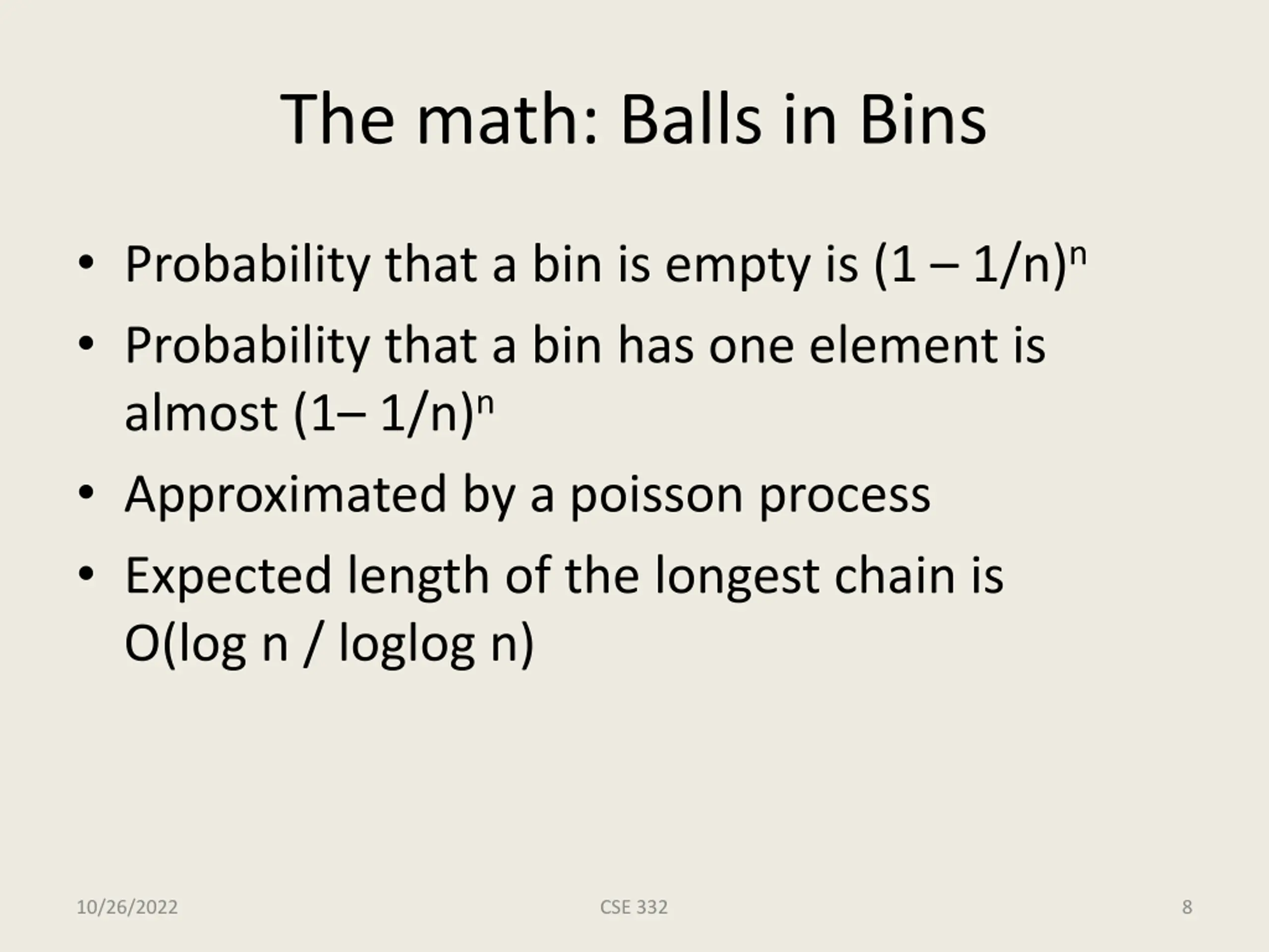 The math: Balls in Bins Probability that a bin is empty is (1 1/n)n Probability that a bin has one element is almost (1 1/n)n Approximated by a poisson process Expected length of the longest chain is O(log n / loglog n) 10/26/2022 CSE 332 8