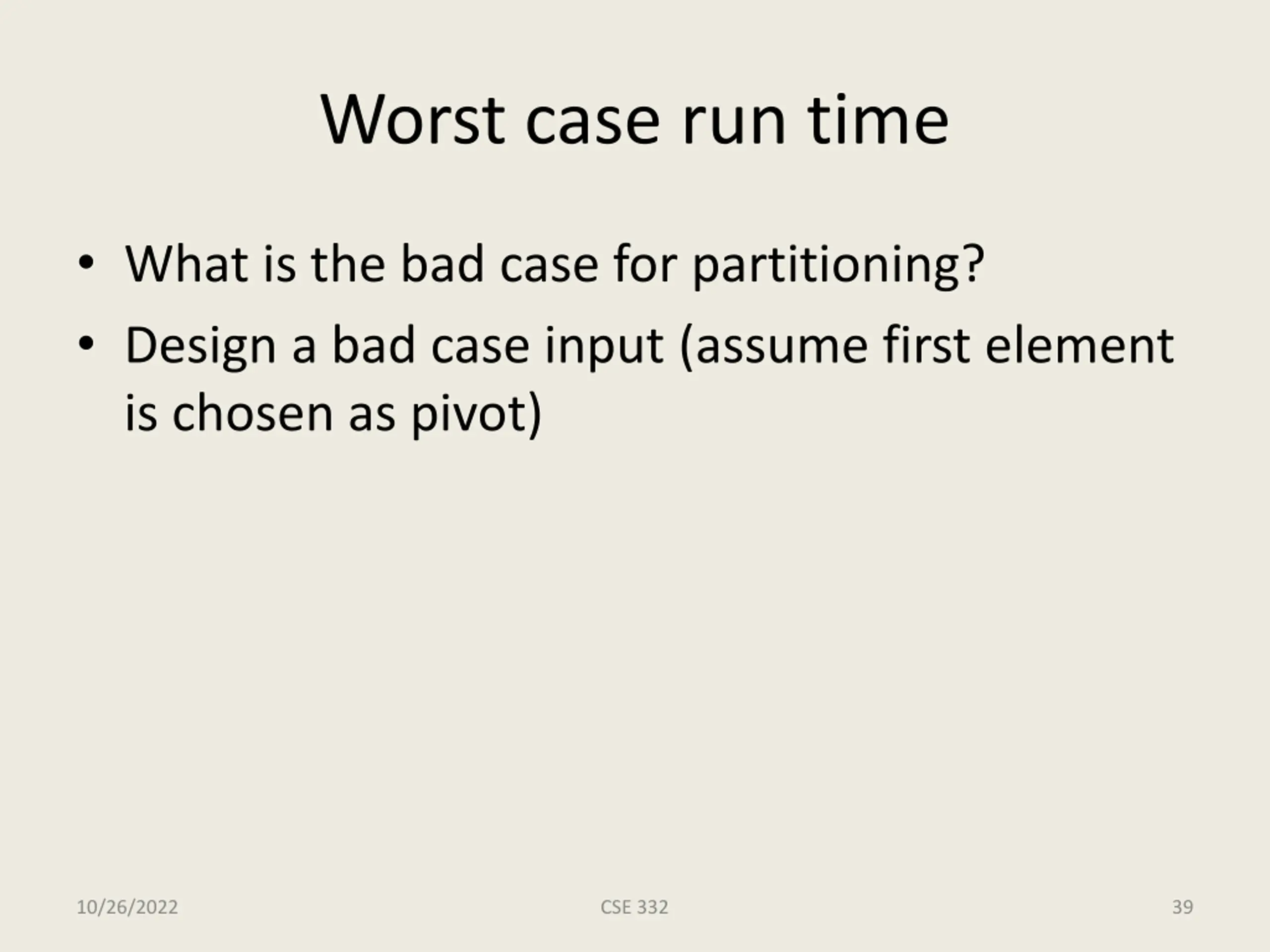 Worst case run time What is the bad case for partitioning? Design a bad case input (assume first element is chosen as pivot) 10/26/2022 CSE 332 39