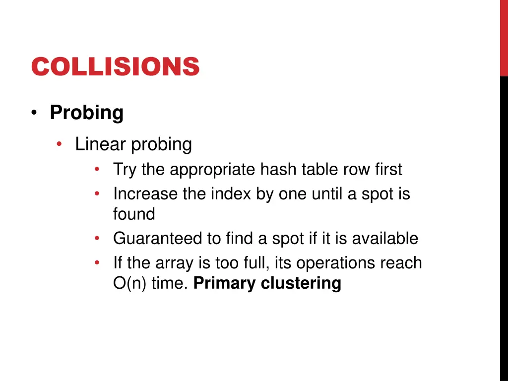 COLLISIONS Probing Linear probing Try the appropriate hash table row first Increase the index by one until a spot is found Guaranteed to find a spot if it is available If the array is too full, its operations reach O(n) time. Primary clustering