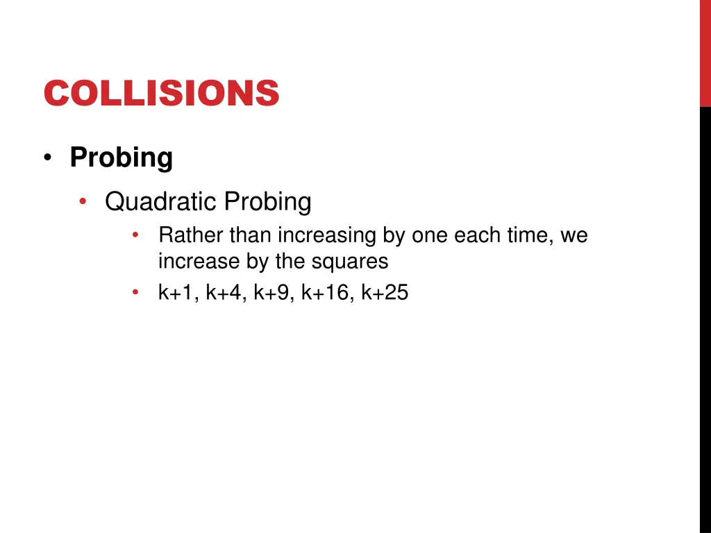 COLLISIONS Probing Quadratic Probing Rather than increasing by one each time, we increase by the squares k+1, k+4, k+9, k+16, k+25
