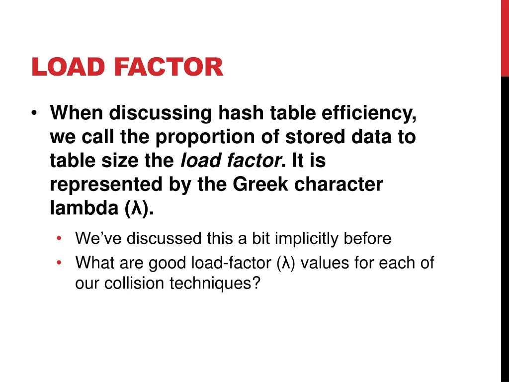 LOAD FACTOR When discussing hash table efficiency, we call the proportion of stored data to table size the load factor. It is represented by the Greek character lambda ( ). We ve discussed this a bit implicitly before What are good load-factor ( ) values for each of our collision techniques?