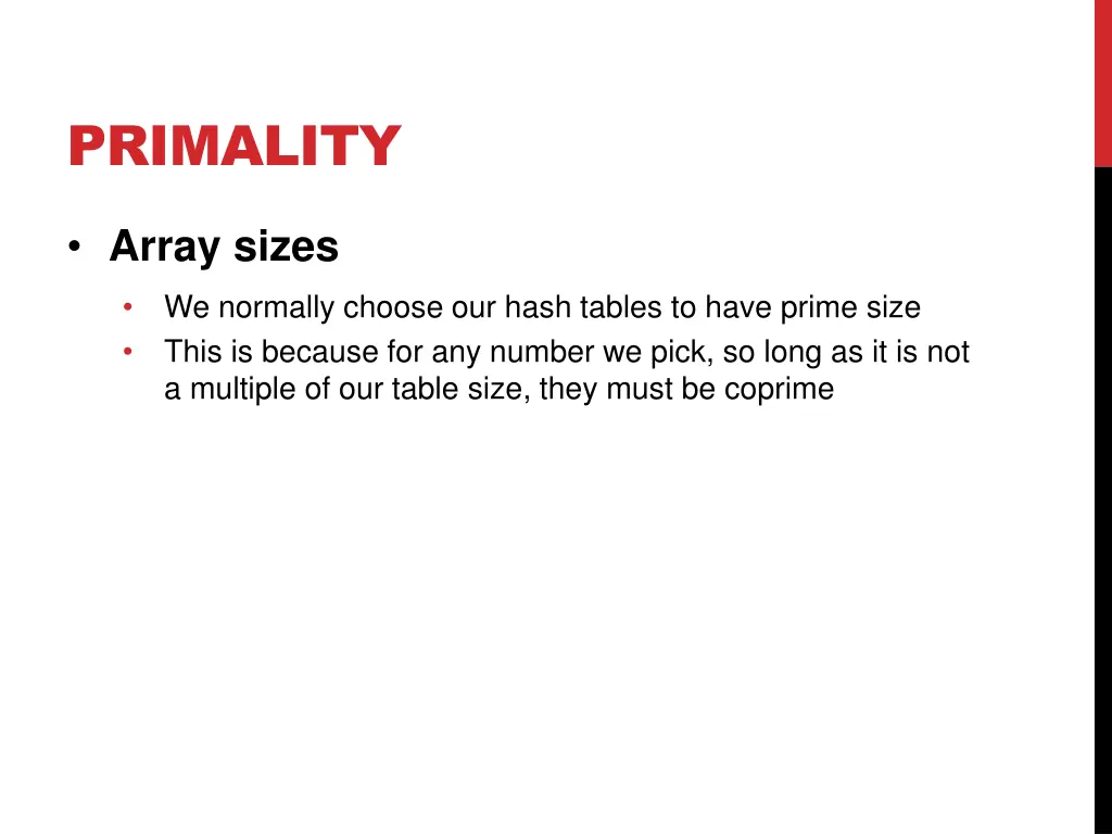 PRIMALITY Array sizes We normally choose our hash tables to have prime size This is because for any number we pick, so long as it is not a multiple of our table size, they must be coprime