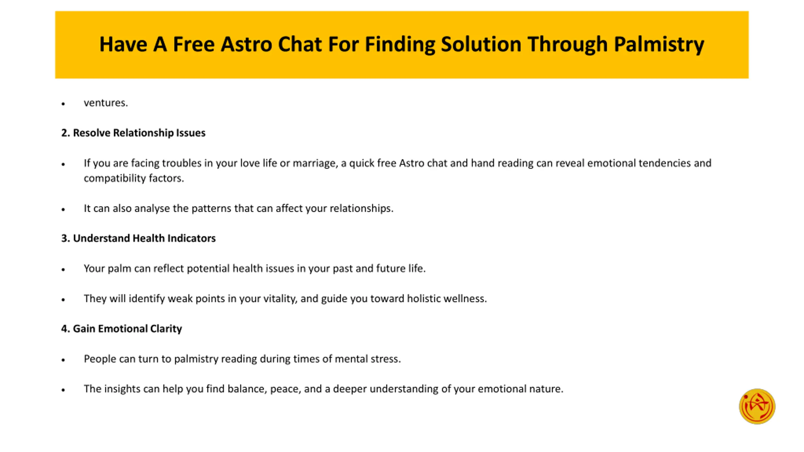 Have A Free Astro Chat For Finding Solution Through Palmistry ventures. 2. Resolve Relationship Issues If you are facing troubles in your love life or marriage, a quick free Astro chat and hand reading can reveal emotional tendencies and compatibility factors. It can also analyse the patterns that can affect your relationships. 3. Understand Health Indicators Your palm can reflect potential health issues in your past and future life. They will identify weak points in your vitality, and guide you toward holistic wellness. 4. Gain Emotional Clarity People can turn to palmistry reading during times of mental stress. The insights can help you find balance, peace, and a deeper understanding of your emotional nature.