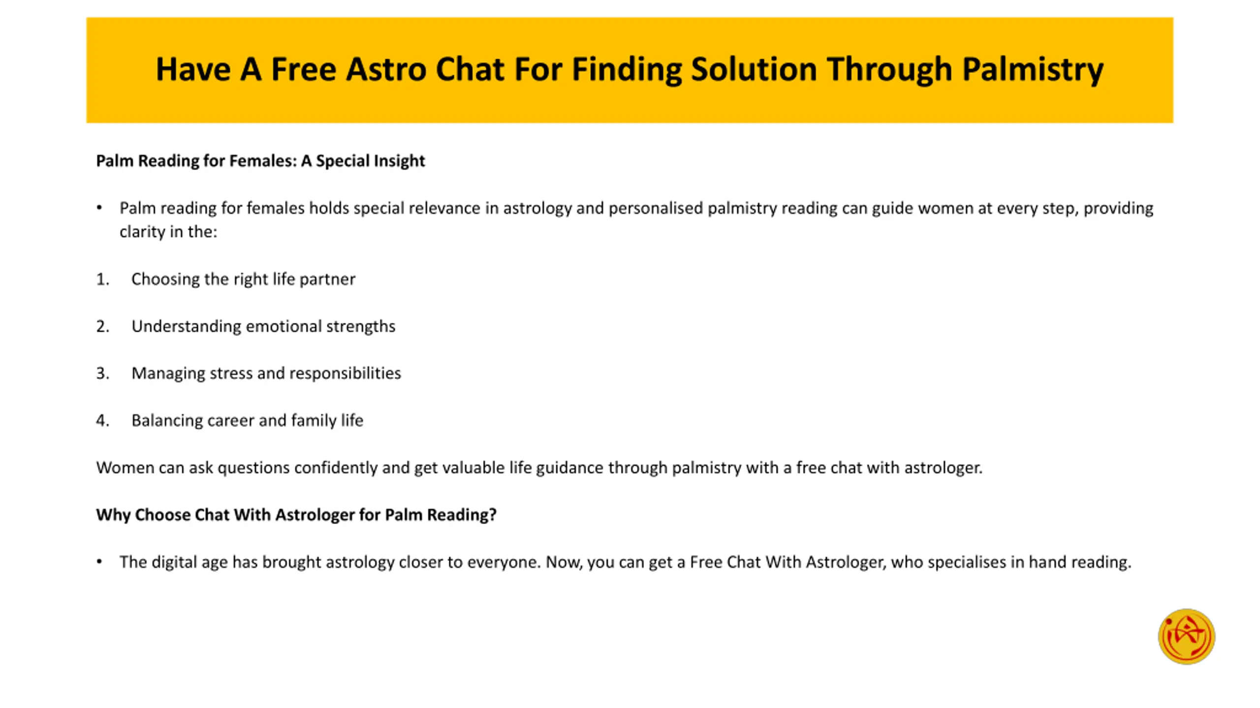Have A Free Astro Chat For Finding Solution Through Palmistry Palm Reading for Females: A Special Insight Palm reading for females holds special relevance in astrology and personalised palmistry reading can guide women at every step, providing clarity in the: 1. Choosing the right life partner 2. Understanding emotional strengths 3. Managing stress and responsibilities 4. Balancing career and family life Women can ask questions confidently and get valuable life guidance through palmistry with a free chat with astrologer. Why Choose Chat With Astrologer for Palm Reading? The digital age has brought astrology closer to everyone. Now, you can get a Free Chat With Astrologer, who specialises in hand reading.