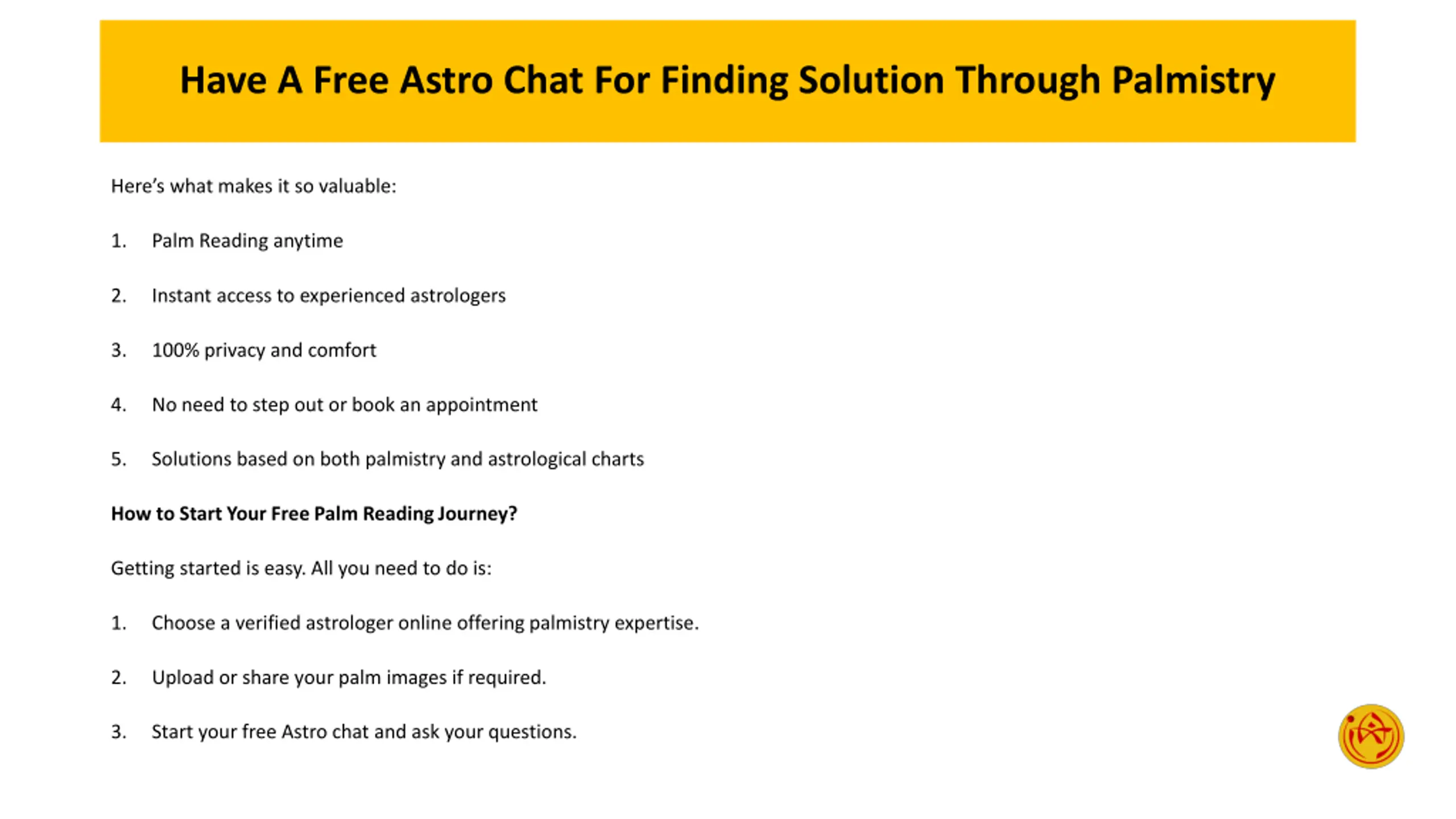 Have A Free Astro Chat For Finding Solution Through Palmistry Are you living a happy life, the way you planned or manifest for yourself? Is your life going smoothly? If not! Are you regularly facing challenges in love, career, or health? The answers to all these questions lie in the lines of your hands. You can hold your life in your hand with the ancient wisdom of palmistry, which is also known as hand reading. The best way to uncover hidden truths about your life is based on karma. The interesting part is that you can now chat with astrologer to get your free palm reading anytime, anywhere. How Does Palmistry Work? It is an ancient practice that decodes the lines, shapes, and mounts on your palms to reveal insights about your personality, potential, and future. It helps highlight your strengths and caution you against possible pitfalls whether it is your career direction, relationship clarity, or health concerns. Benefits of Palmistry in Solving Life s Challenges Palm reading is a tool combined with astrology and a powerful method of self-awareness and problem-solving. 1. Find the Right Career Path The Astrologer can identify your natural talents and suggest suitable career directions through palmistry reading. It can be helpful for young individuals confused about education, job choices, or business ventures.