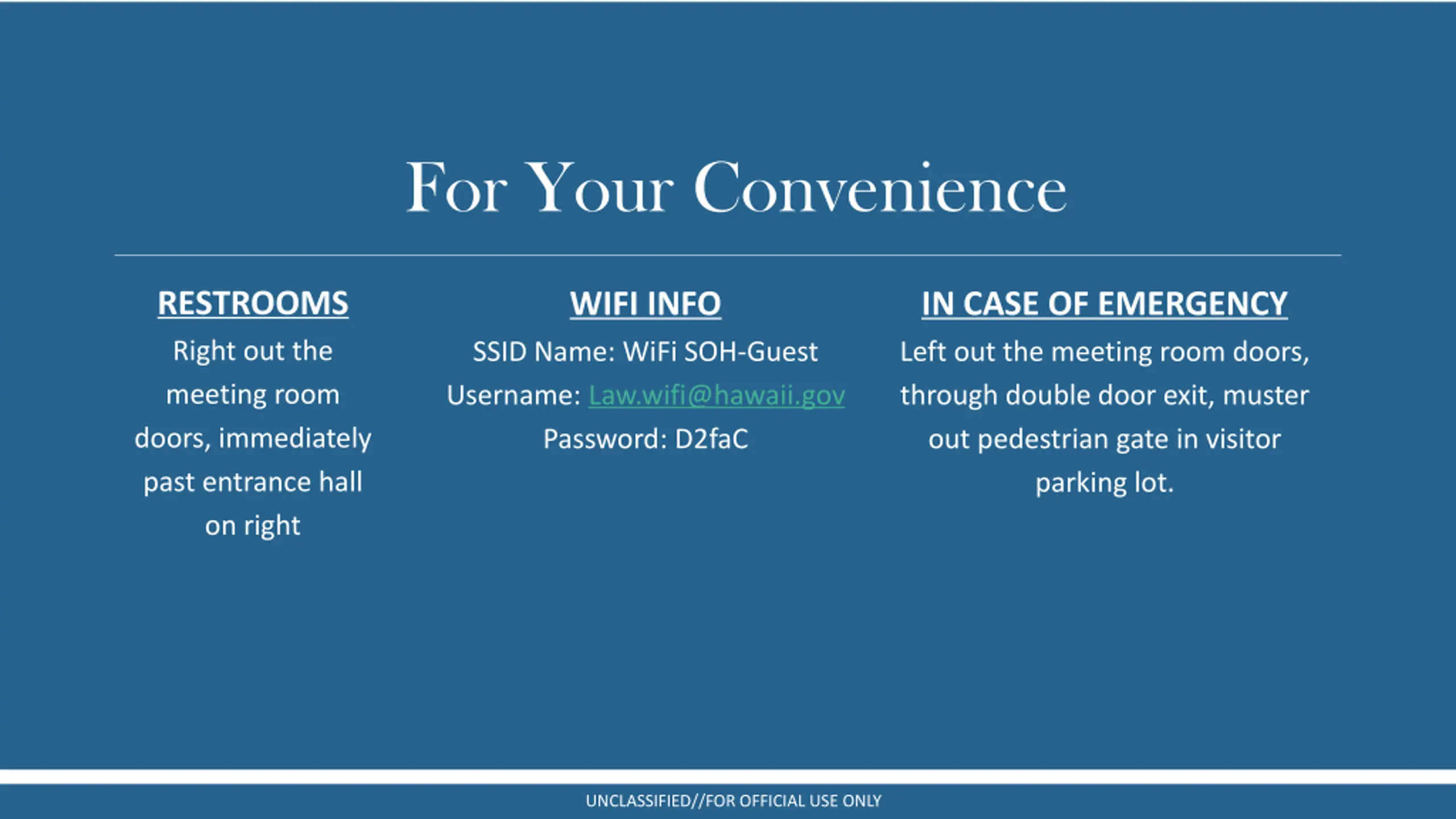 State of Hawaii Office of Homeland Security For Your Convenience RESTROOMS Right out the meeting room doors, immediately past entrance hall on right WIFI INFO IN CASE OF EMERGENCY Left out the meeting room doors, through double door exit, muster out pedestrian gate in visitor parking lot. SSID Name: WiFi SOH-Guest Username: Law.wifi@hawaii.gov Password: D2faC UNCLASSIFIED//FOR OFFICIAL USE ONLY