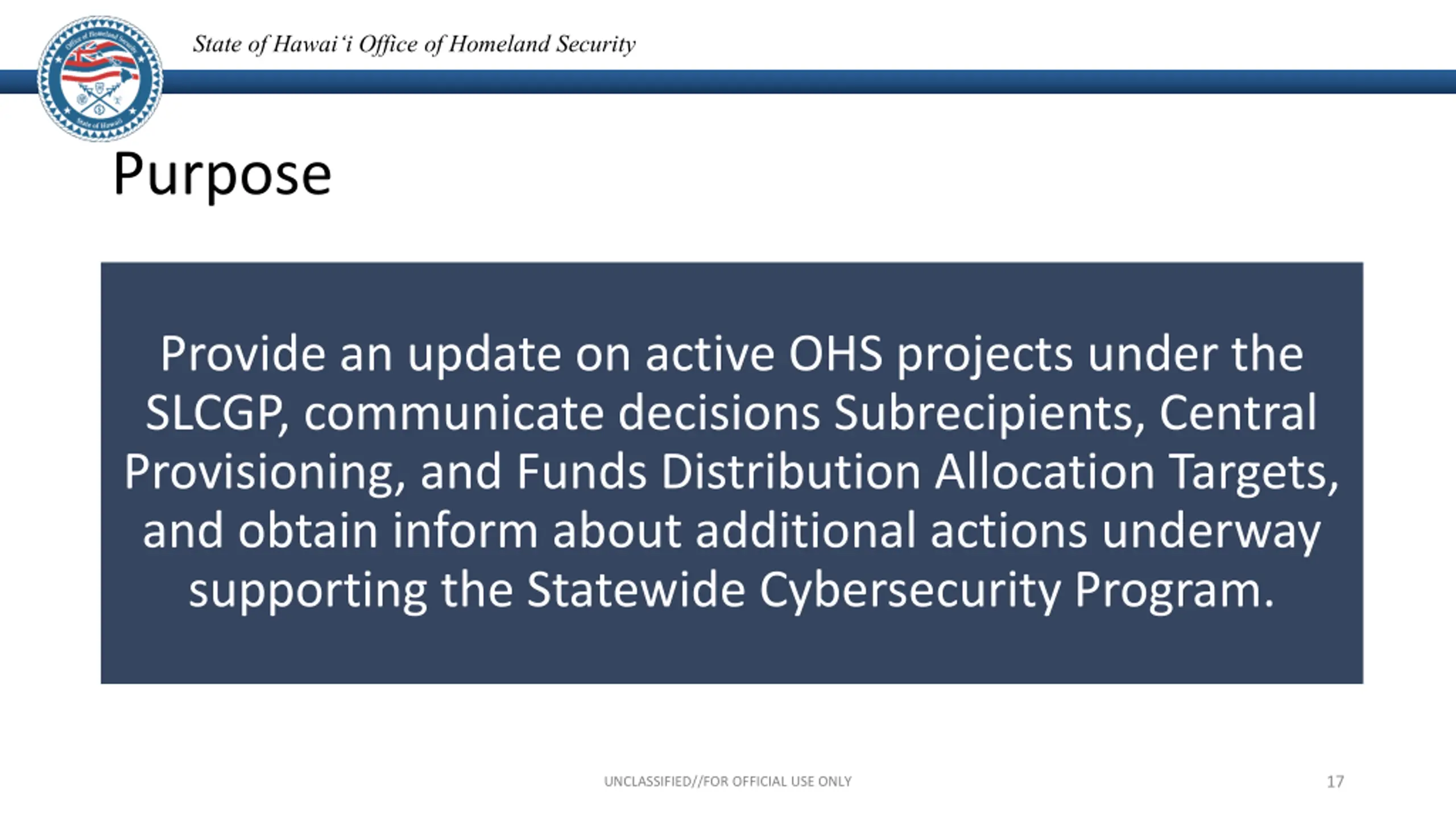 State of Hawaii Office of Homeland Security Purpose Provide an update on active OHS projects under the SLCGP, communicate decisions Subrecipients, Central Provisioning, and Funds Distribution Allocation Targets, and obtain inform about additional actions underway supporting the Statewide Cybersecurity Program. 17 UNCLASSIFIED//FOR OFFICIAL USE ONLY