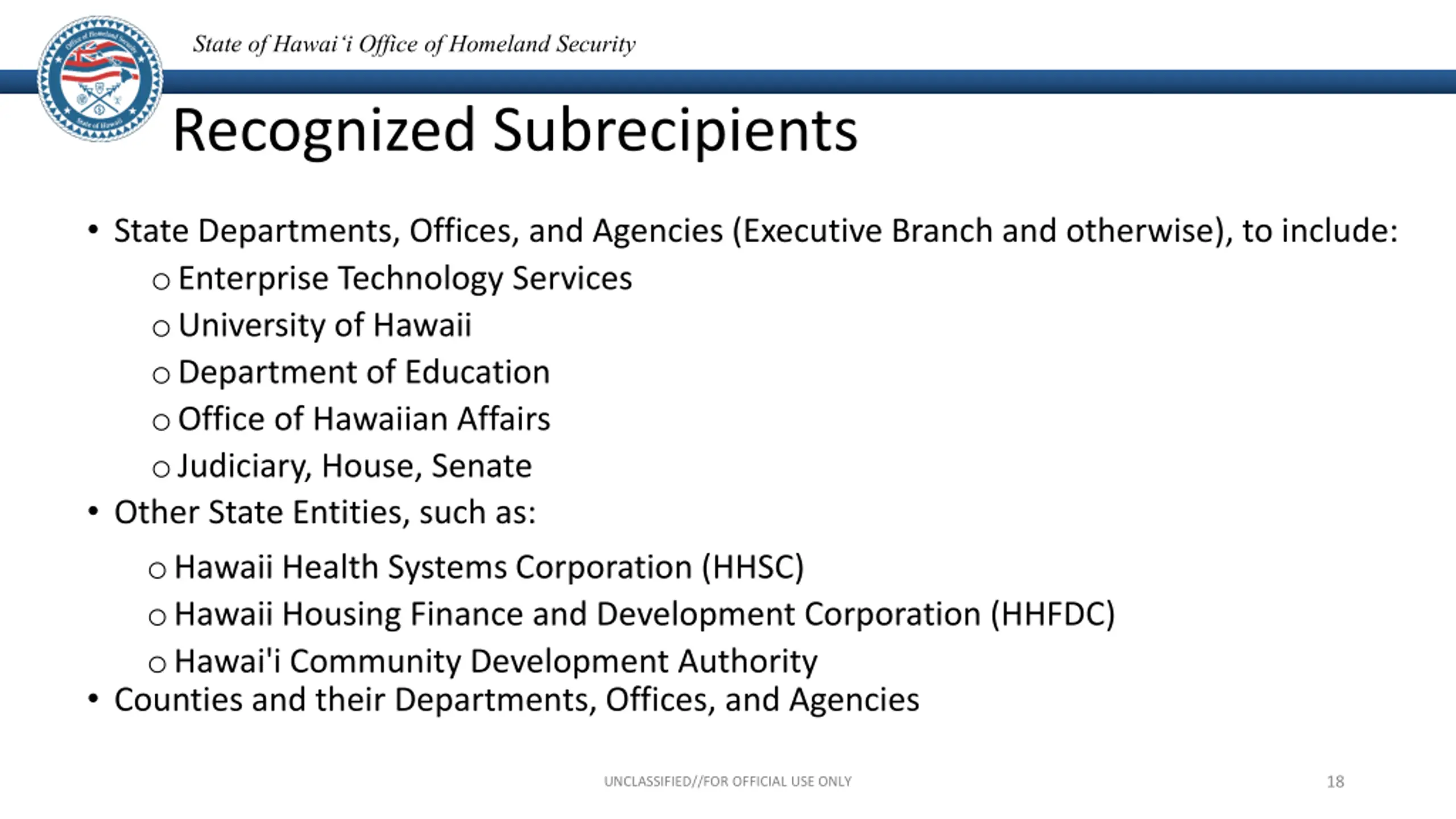 State of Hawaii Office of Homeland Security Recognized Subrecipients State Departments, Offices, and Agencies (Executive Branch and otherwise), to include: oEnterprise Technology Services oUniversity of Hawaii oDepartment of Education oOffice of Hawaiian Affairs oJudiciary, House, Senate Other State Entities, such as: oHawaii Health Systems Corporation (HHSC) oHawaii Housing Finance and Development Corporation (HHFDC) oHawai'i Community Development Authority Counties and their Departments, Offices, and Agencies 18 UNCLASSIFIED//FOR OFFICIAL USE ONLY