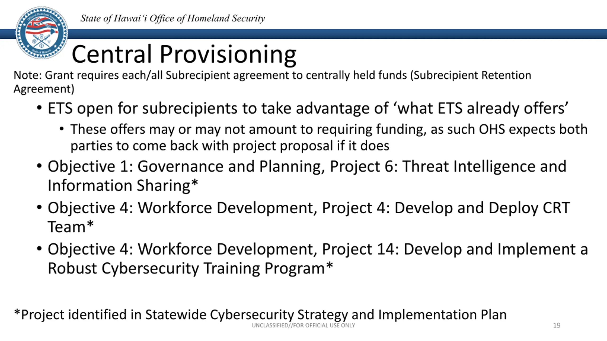 State of Hawaii Office of Homeland Security Central Provisioning Note: Grant requires each/all Subrecipient agreement to centrally held funds (Subrecipient Retention Agreement) ETS open for subrecipients to take advantage of what ETS already offers These offers may or may not amount to requiring funding, as such OHS expects both parties to come back with project proposal if it does Objective 1: Governance and Planning, Project 6: Threat Intelligence and Information Sharing* Objective 4: Workforce Development, Project 4: Develop and Deploy CRT Team* Objective 4: Workforce Development, Project 14: Develop and Implement a Robust Cybersecurity Training Program* *Project identified in Statewide Cybersecurity Strategy and Implementation Plan UNCLASSIFIED//FOR OFFICIAL USE ONLY 19