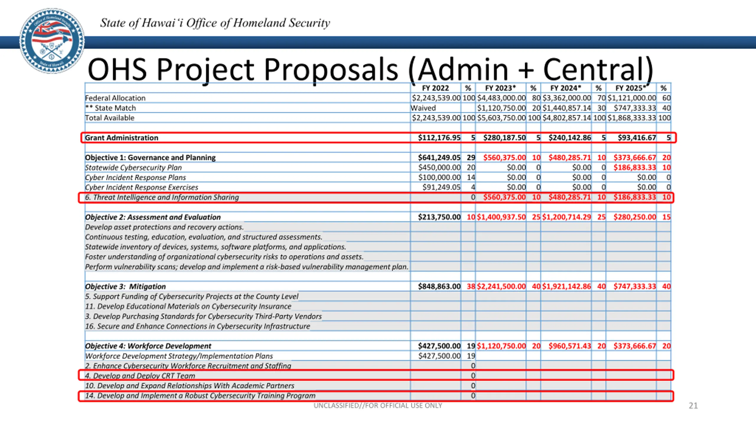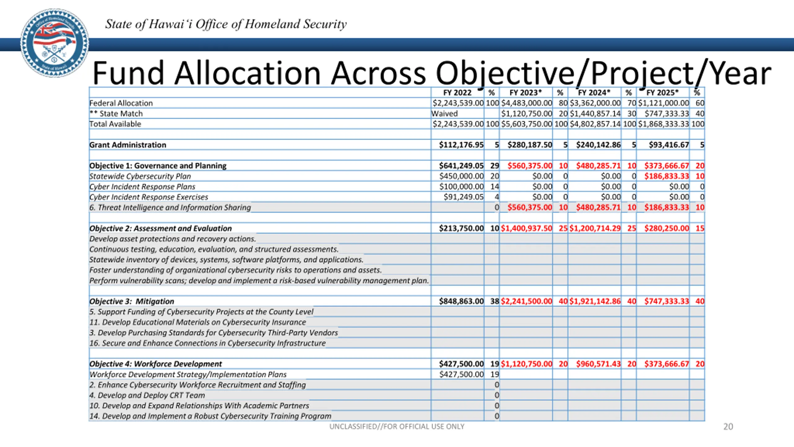 State of Hawaii Office of Homeland Security Fund Allocation Across Objective/Project/Year FY 2022 $2,243,539.00 100 $4,483,000.00 80 $3,362,000.00 70 $1,121,000.00 60 Waived $1,120,750.00 20 $1,440,857.14 30 $2,243,539.00 100 $5,603,750.00 100 $4,802,857.14 100 $1,868,333.33 100 % FY 2023* % FY 2024* % FY 2025* % Federal Allocation ** State Match Total Available $747,333.33 40 $112,176.95 5 $280,187.50 5 $240,142.86 5 $93,416.67 5 Grant Administration $641,249.05 29 $450,000.00 20 $100,000.00 14 $91,249.05 $560,375.00 10 $0.00 $0.00 $0.00 $560,375.00 10 $480,285.71 10 $0.00 $0.00 $0.00 $480,285.71 10 $373,666.67 20 $186,833.33 10 $0.00 $0.00 $186,833.33 10 Objective 1: Governance and Planning Statewide Cybersecurity Plan Cyber Incident Response Plans Cyber Incident Response Exercises 6. Threat Intelligence and Information Sharing 0 0 0 0 0 0 0 0 4 0 $213,750.00 10$1,400,937.50 25$1,200,714.29 25 $280,250.00 15 Objective 2: Assessment and Evaluation Develop asset protections and recovery actions. Continuous testing, education, evaluation, and structured assessments. Statewide inventory of devices, systems, software platforms, and applications. Foster understanding of organizational cybersecurity risks to operations and assets. Perform vulnerability scans; develop and implement a risk-based vulnerability management plan. $848,863.00 38$2,241,500.00 40$1,921,142.86 40 $747,333.33 40 Objective 3: Mitigation 5. Support Funding of Cybersecurity Projects at the County Level 11. Develop Educational Materials on Cybersecurity Insurance 3. Develop Purchasing Standards for Cybersecurity Third-Party Vendors 16. Secure and Enhance Connections in Cybersecurity Infrastructure $427,500.00 19$1,120,750.00 20 $427,500.00 19 0 0 0 0 $960,571.43 20 $373,666.67 20 Objective 4: Workforce Development Workforce Development Strategy/Implementation Plans 2. Enhance Cybersecurity Workforce Recruitment and Staffing 4. Develop and Deploy CRT Team 10. Develop and Expand Relationships With Academic Partners 14. Develop and Implement a Robust Cybersecurity Training Program 20 UNCLASSIFIED//FOR OFFICIAL USE ONLY