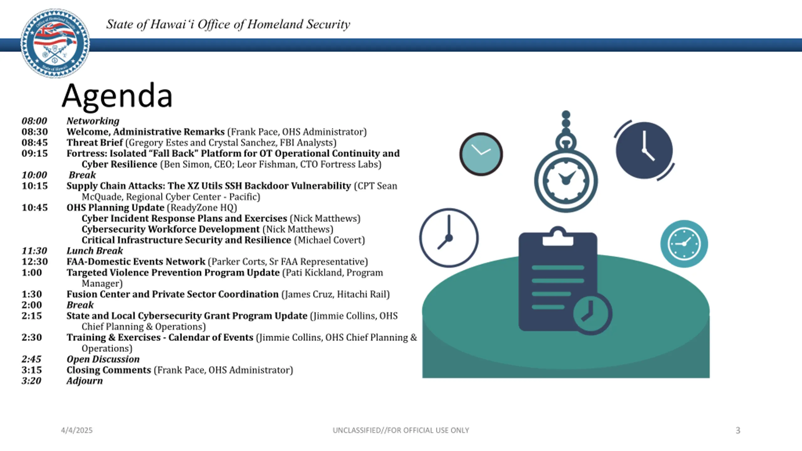 State of Hawaii Office of Homeland Security Agenda 08:00 08:30 08:45 09:15 Networking Welcome, Administrative Remarks (Frank Pace, OHS Administrator) Threat Brief (Gregory Estes and Crystal Sanchez, FBI Analysts) Fortress: Isolated Fall Back" Platform for OT Operational Continuity and Cyber Resilience (Ben Simon, CEO; Leor Fishman, CTO Fortress Labs) Break Supply Chain Attacks: The XZ Utils SSH Backdoor Vulnerability (CPT Sean McQuade, Regional Cyber Center - Pacific) OHS Planning Update (ReadyZone HQ) Cyber Incident Response Plans and Exercises (Nick Matthews) Cybersecurity Workforce Development (Nick Matthews) Critical Infrastructure Security and Resilience (Michael Covert) Lunch Break FAA-Domestic Events Network (Parker Corts, Sr FAA Representative) Targeted Violence Prevention Program Update (Pati Kickland, Program Manager) Fusion Center and Private Sector Coordination (James Cruz, Hitachi Rail) Break State and Local Cybersecurity Grant Program Update (Jimmie Collins, OHS Chief Planning & Operations) Training & Exercises - Calendar of Events (Jimmie Collins, OHS Chief Planning & Operations) Open Discussion Closing Comments (Frank Pace, OHS Administrator) Adjourn 10:00 10:15 10:45 11:30 12:30 1:00 1:30 2:00 2:15 2:30 2:45 3:15 3:20 3 4/4/2025 UNCLASSIFIED//FOR OFFICIAL USE ONLY