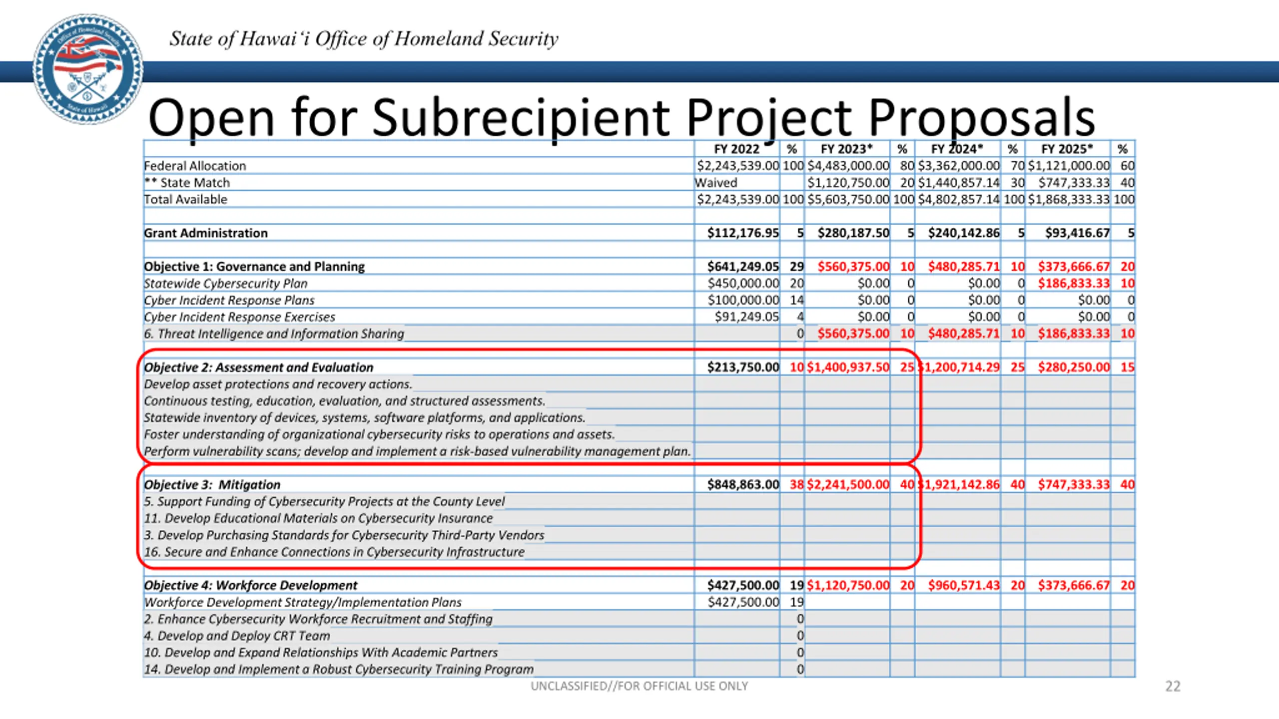 State of Hawaii Office of Homeland Security Open for Subrecipient Project Proposals FY 2022 $2,243,539.00 100 $4,483,000.00 80 $3,362,000.00 70 $1,121,000.00 60 Waived $1,120,750.00 20 $1,440,857.14 30 $2,243,539.00 100 $5,603,750.00 100 $4,802,857.14 100 $1,868,333.33 100 % FY 2023* % FY 2024* % FY 2025* % Federal Allocation ** State Match Total Available $747,333.33 40 $112,176.95 5 $280,187.50 5 $240,142.86 5 $93,416.67 5 Grant Administration $641,249.05 29 $450,000.00 20 $100,000.00 14 $91,249.05 $560,375.00 10 $0.00 $0.00 $0.00 $560,375.00 10 $480,285.71 10 $0.00 $0.00 $0.00 $480,285.71 10 $373,666.67 20 $186,833.33 10 $0.00 $0.00 $186,833.33 10 Objective 1: Governance and Planning Statewide Cybersecurity Plan Cyber Incident Response Plans Cyber Incident Response Exercises 6. Threat Intelligence and Information Sharing 0 0 0 0 0 0 0 0 4 0 $213,750.00 10$1,400,937.50 25$1,200,714.29 25 $280,250.00 15 Objective 2: Assessment and Evaluation Develop asset protections and recovery actions. Continuous testing, education, evaluation, and structured assessments. Statewide inventory of devices, systems, software platforms, and applications. Foster understanding of organizational cybersecurity risks to operations and assets. Perform vulnerability scans; develop and implement a risk-based vulnerability management plan. $848,863.00 38$2,241,500.00 40$1,921,142.86 40 $747,333.33 40 Objective 3: Mitigation 5. Support Funding of Cybersecurity Projects at the County Level 11. Develop Educational Materials on Cybersecurity Insurance 3. Develop Purchasing Standards for Cybersecurity Third-Party Vendors 16. Secure and Enhance Connections in Cybersecurity Infrastructure $427,500.00 19$1,120,750.00 20 $427,500.00 19 0 0 0 0 $960,571.43 20 $373,666.67 20 Objective 4: Workforce Development Workforce Development Strategy/Implementation Plans 2. Enhance Cybersecurity Workforce Recruitment and Staffing 4. Develop and Deploy CRT Team 10. Develop and Expand Relationships With Academic Partners 14. Develop and Implement a Robust Cybersecurity Training Program 22 UNCLASSIFIED//FOR OFFICIAL USE ONLY