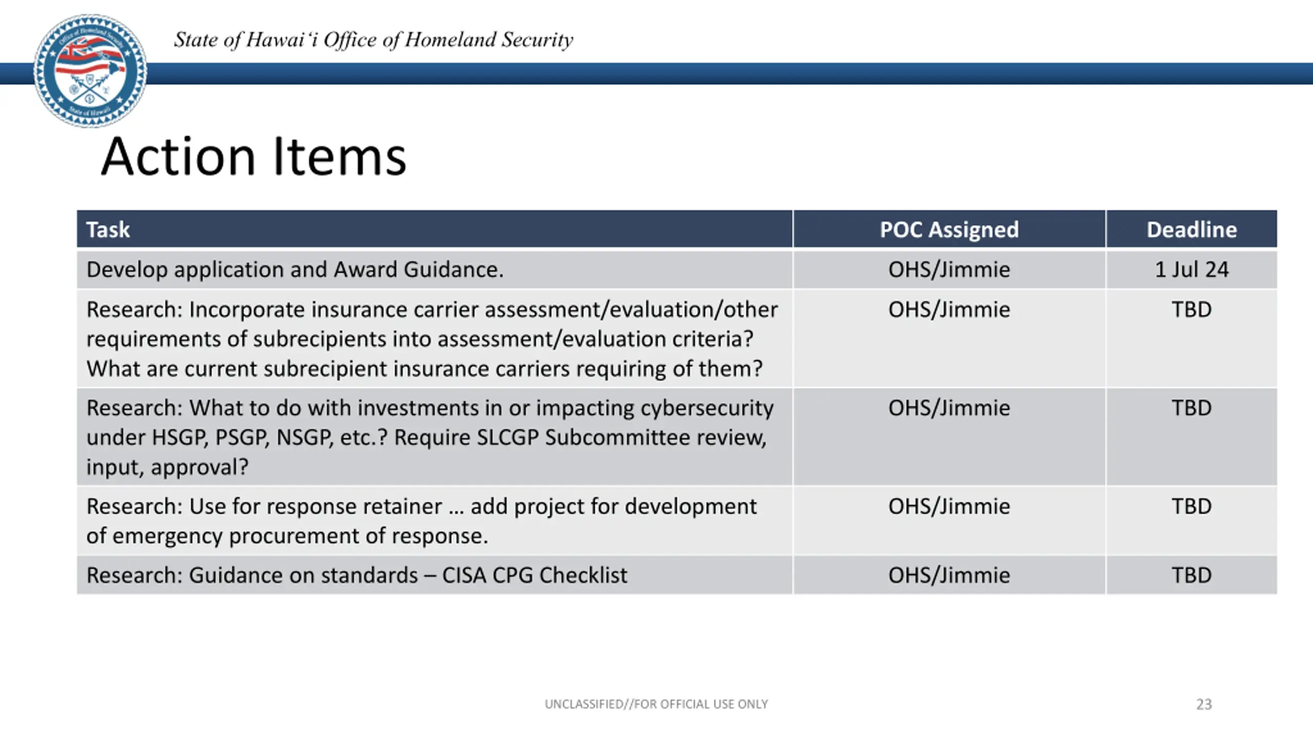 State of Hawaii Office of Homeland Security Action Items Task POC Assigned Deadline Develop application and Award Guidance. OHS/Jimmie 1 Jul 24 Research: Incorporate insurance carrier assessment/evaluation/other requirements of subrecipients into assessment/evaluation criteria? What are current subrecipient insurance carriers requiring of them? OHS/Jimmie TBD Research: What to do with investments in or impacting cybersecurity under HSGP, PSGP, NSGP, etc.? Require SLCGP Subcommittee review, input, approval? OHS/Jimmie TBD Research: Use for response retainer add project for development of emergency procurement of response. OHS/Jimmie TBD Research: Guidance on standards CISA CPG Checklist OHS/Jimmie TBD 23 UNCLASSIFIED//FOR OFFICIAL USE ONLY