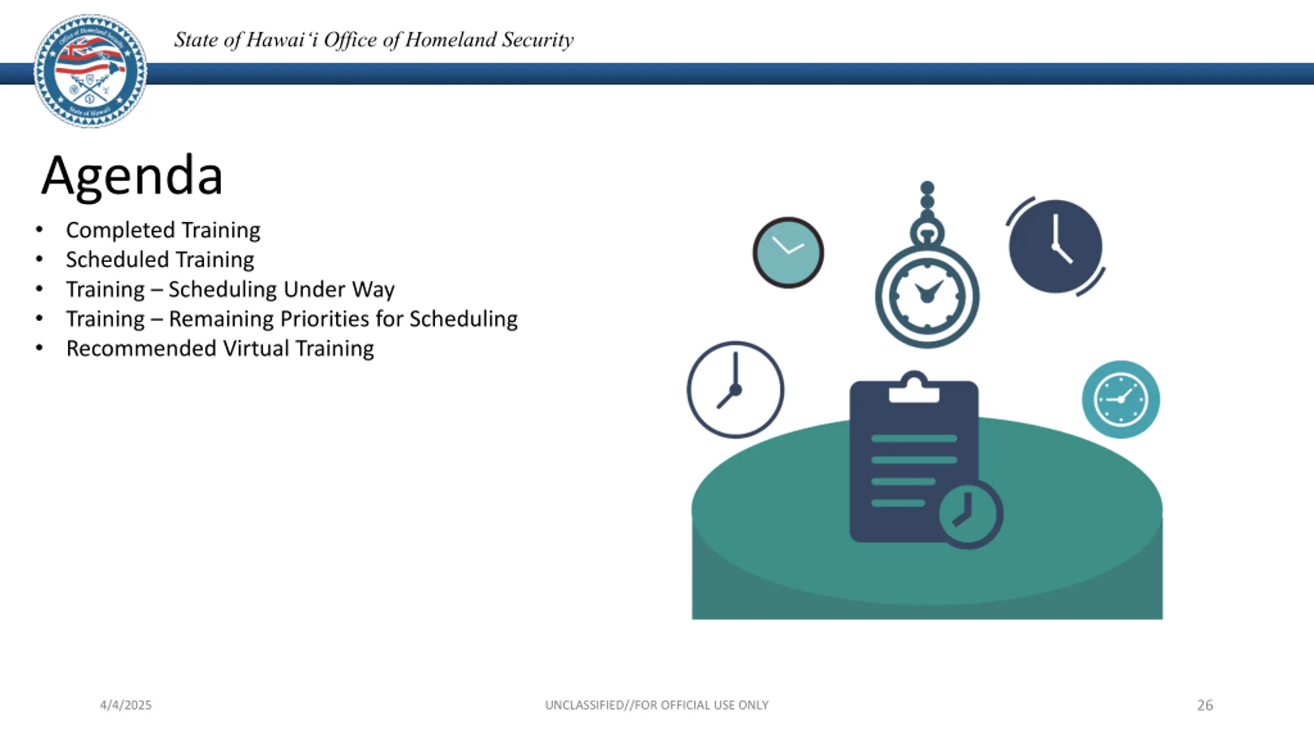State of Hawaii Office of Homeland Security Agenda Completed Training Scheduled Training Training Scheduling Under Way Training Remaining Priorities for Scheduling Recommended Virtual Training 26 4/4/2025 UNCLASSIFIED//FOR OFFICIAL USE ONLY