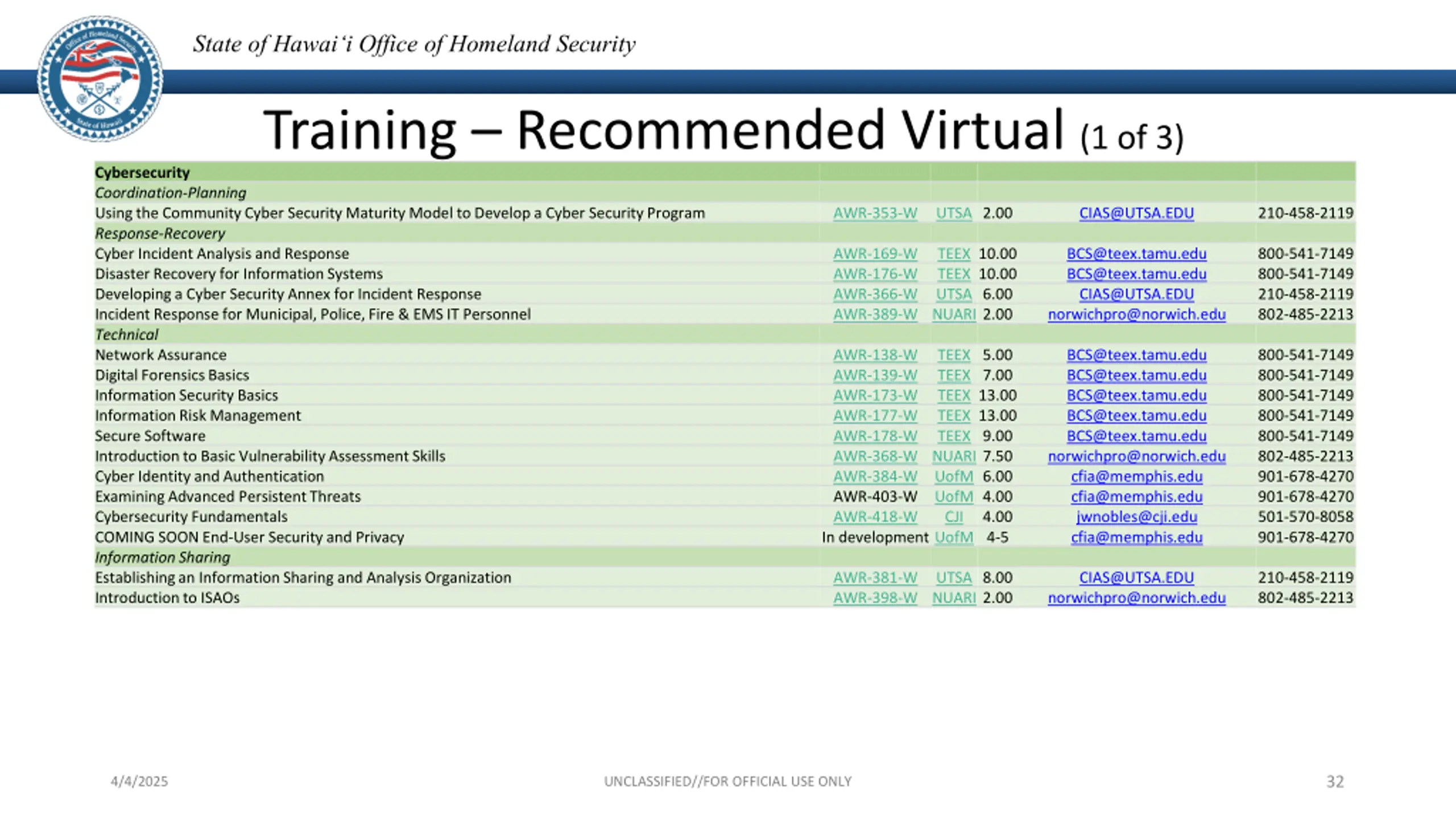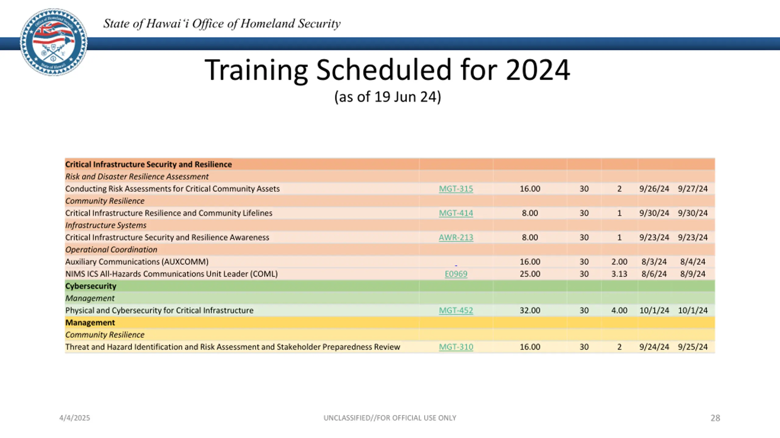 State of Hawaii Office of Homeland Security Training Completed for 2024 (as of 19 Jun 24) Cybersecurity Technical Comprehensive Cybersecurity Defense Malware Prevention, Discovery and Recovery PER-256 PER-382 32.00 32.00 30 30 4.00 4.00 5/21/24 5/28/24 5/24/24 5/31/24 27 4/4/2025 UNCLASSIFIED//FOR OFFICIAL USE ONLY