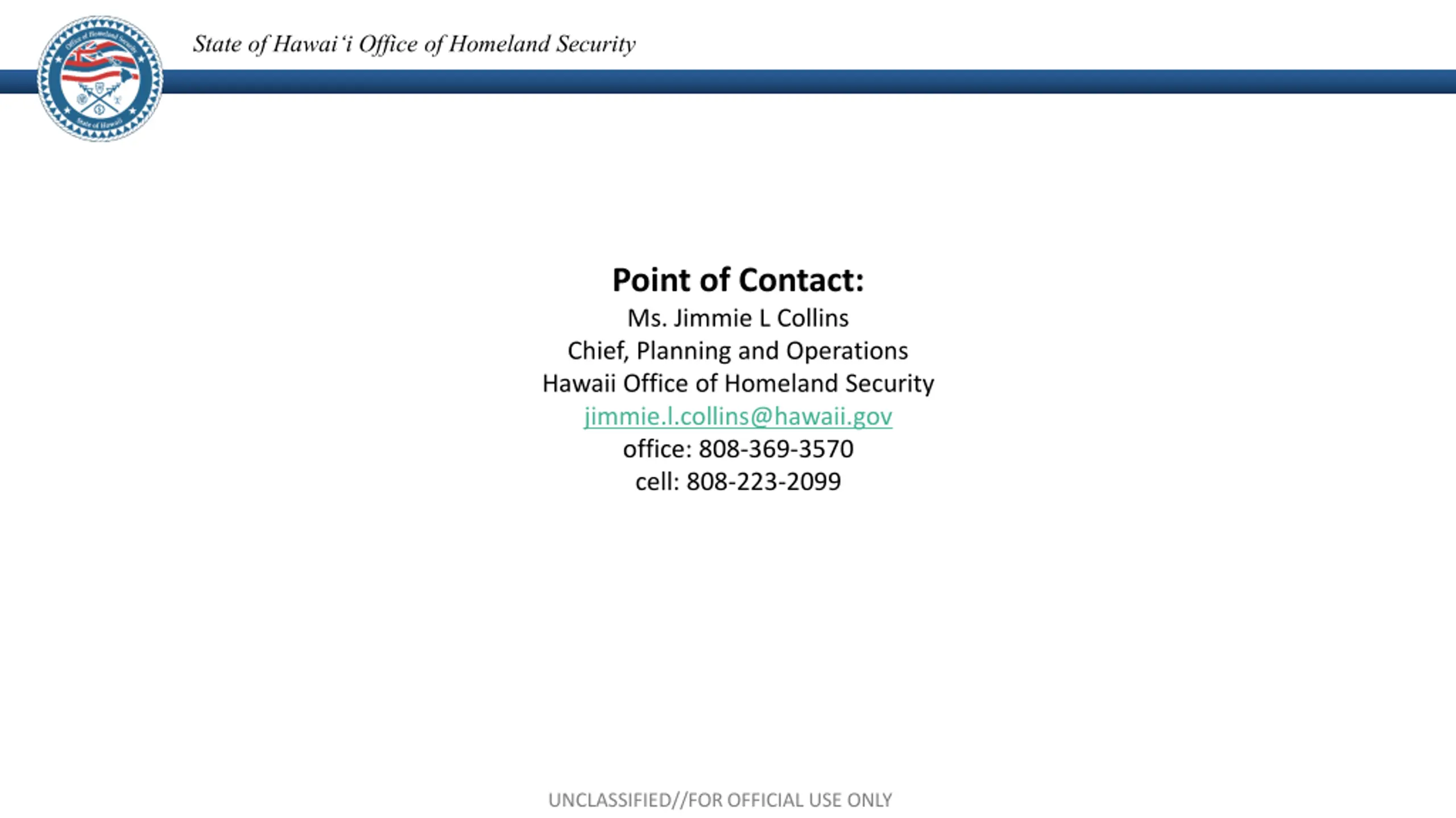 State of Hawaii Office of Homeland Security Point of Contact: Ms. Jimmie L Collins Chief, Planning and Operations Hawaii Office of Homeland Security jimmie.l.collins@hawaii.gov office: 808-369-3570 cell: 808-223-2099 UNCLASSIFIED//FOR OFFICIAL USE ONLY