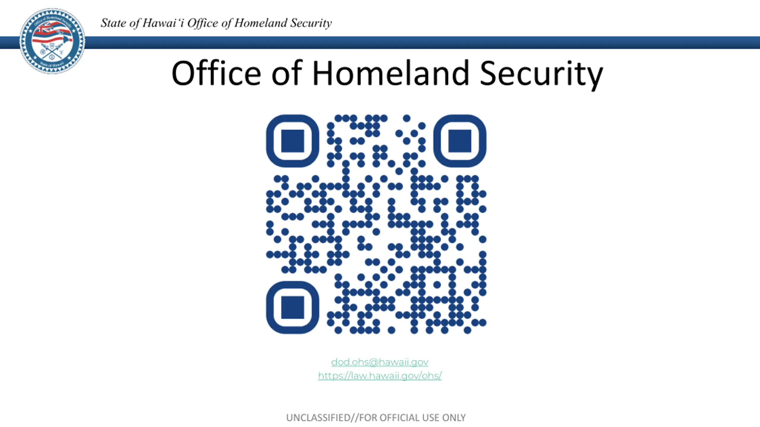 State of Hawaii Office of Homeland Security Office of Homeland Security dod.ohs@hawaii.gov https://law.hawaii.gov/ohs/ UNCLASSIFIED//FOR OFFICIAL USE ONLY