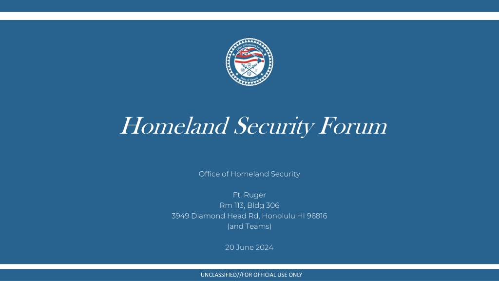 State of Hawaii Office of Homeland Security Homeland Security Forum Office of Homeland Security Ft. Ruger Rm 113, Bldg 306 3949 Diamond Head Rd, Honolulu HI 96816 (and Teams) 20 June 2024 UNCLASSIFIED//FOR OFFICIAL USE ONLY
