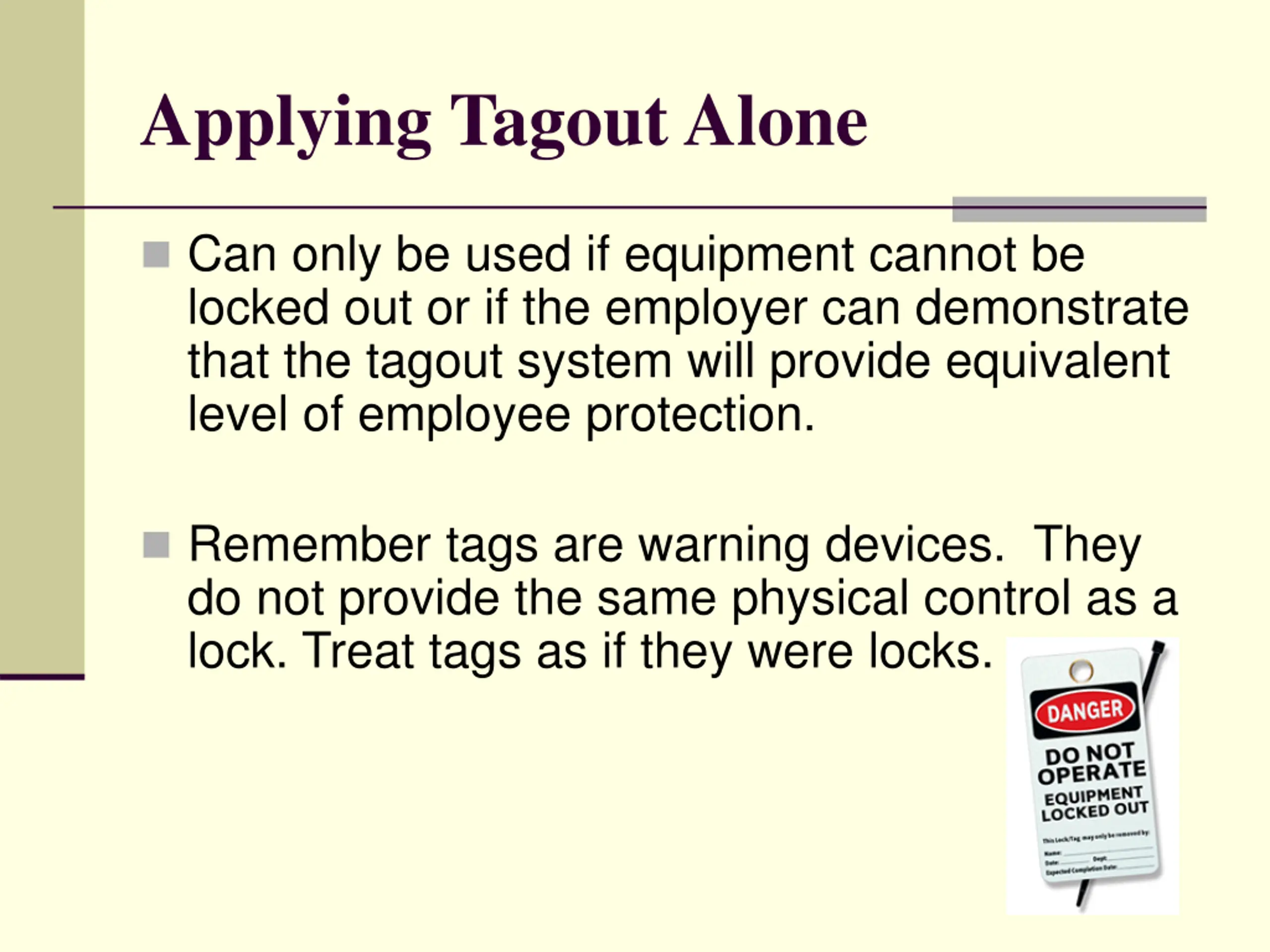 Applying Tagout Alone Can only be used if equipment cannot be locked out or if the employer can demonstrate that the tagout system will provide equivalent level of employee protection. Remember tags are warning devices. They do not provide the same physical control as a lock. Treat tags as if they were locks. . Lockout OSHA Tags