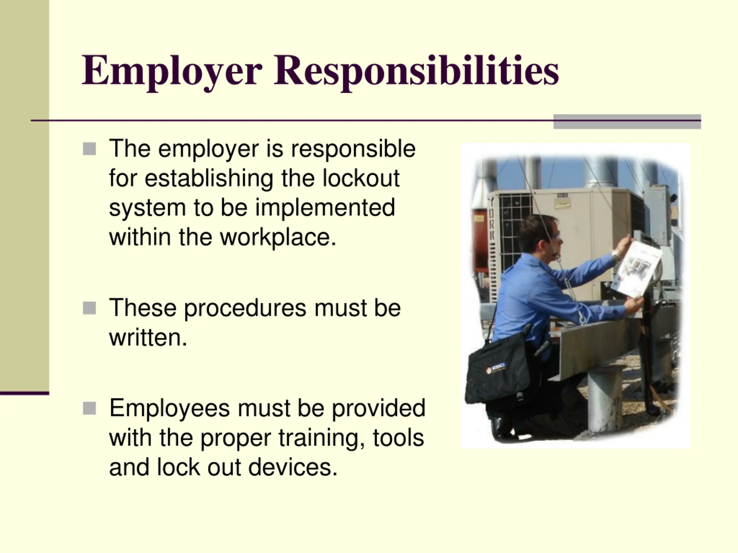 Employer Responsibilities The employer is responsible for establishing the lockout system to be implemented within the workplace. These procedures must be written. Employees must be provided with the proper training, tools and lock out devices.