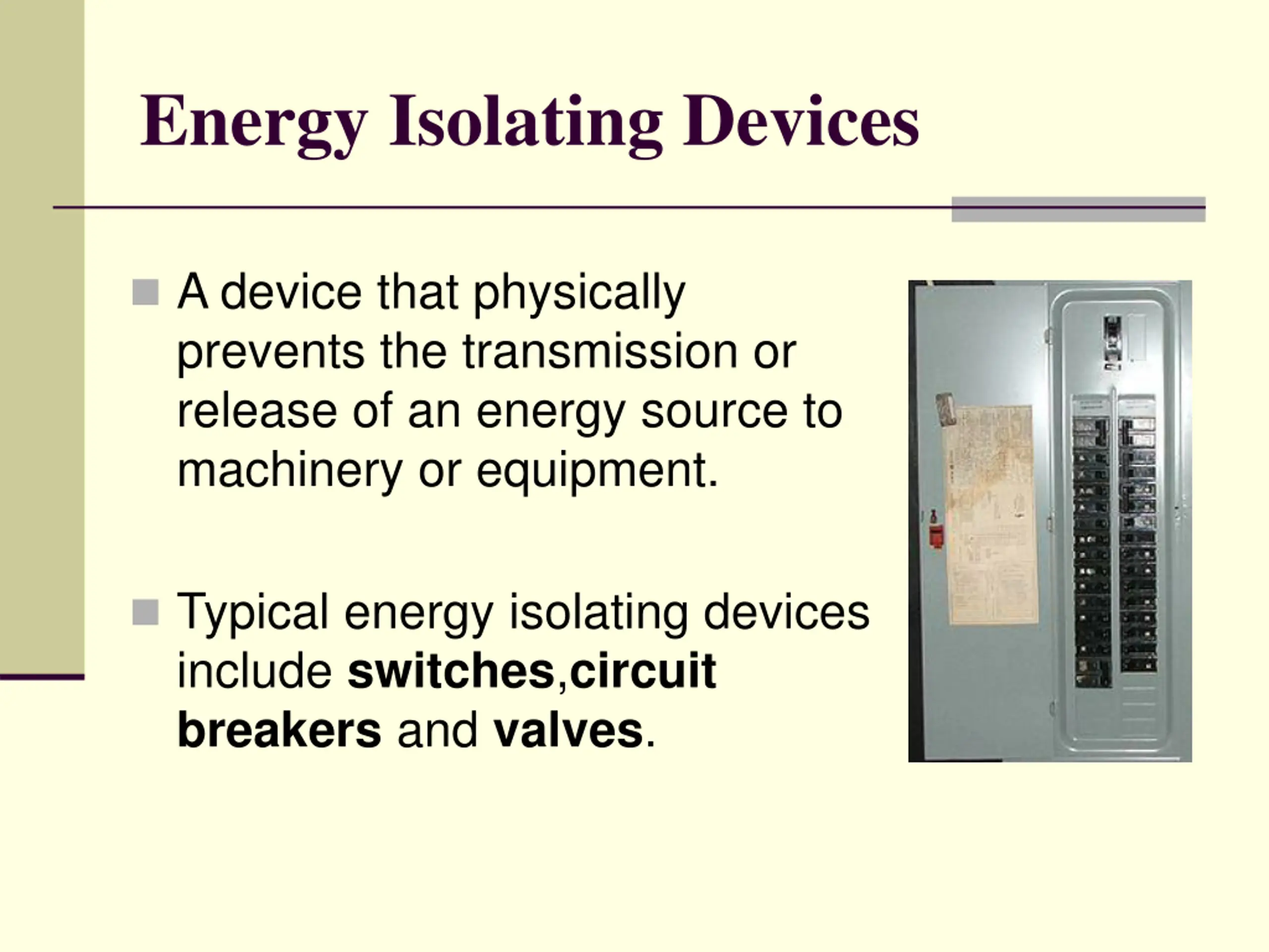 Energy Isolating Devices A device that physically prevents the transmission or release of an energy source to machinery or equipment. 180px-ElectricalPanel Typical energy isolating devices include switches,circuit breakers and valves.