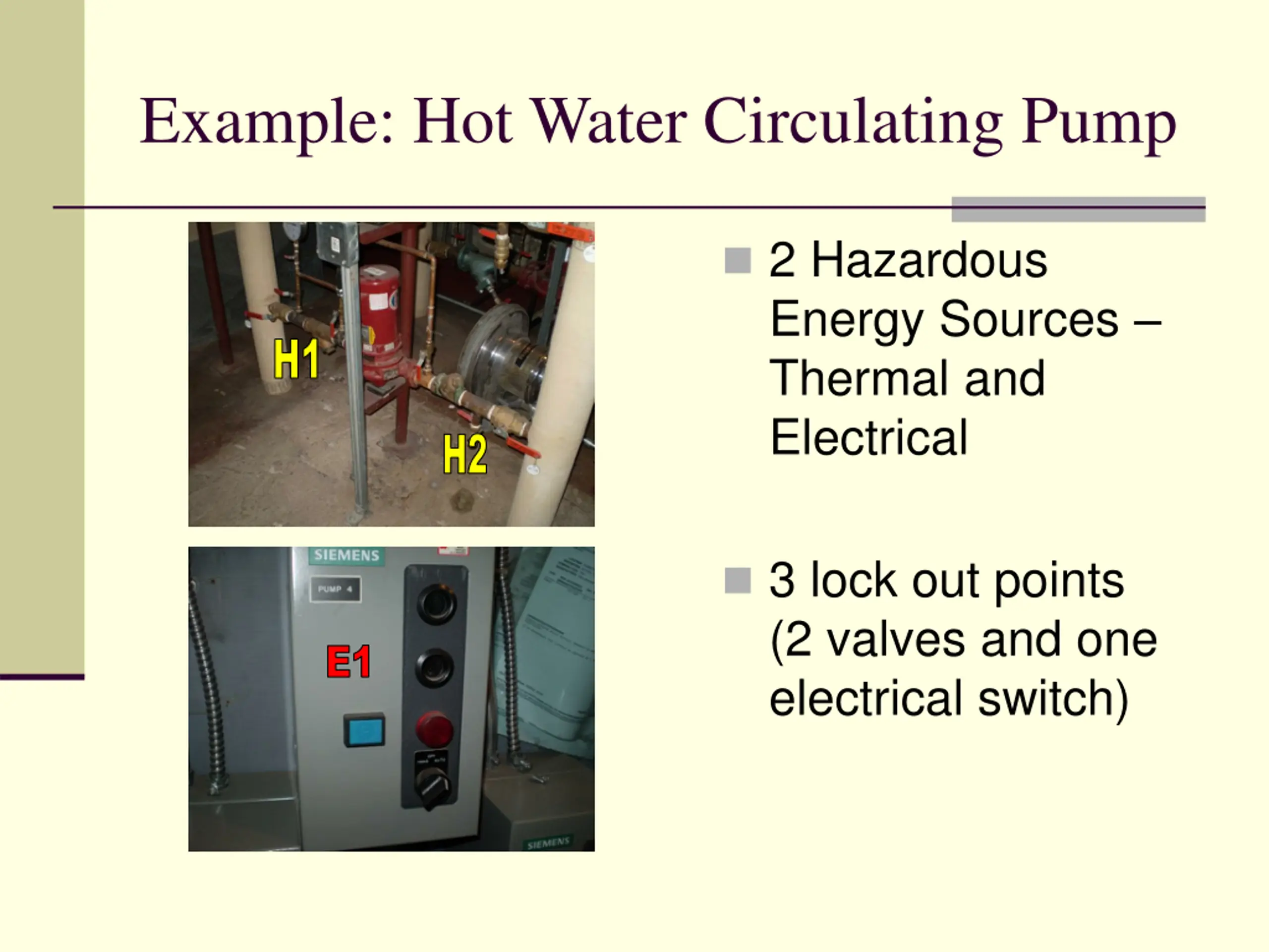 Example: Hot Water Circulating Pump 2 Hazardous Energy Sources Thermal and Electrical H1 H2 3 lock out points (2 valves and one electrical switch) E1