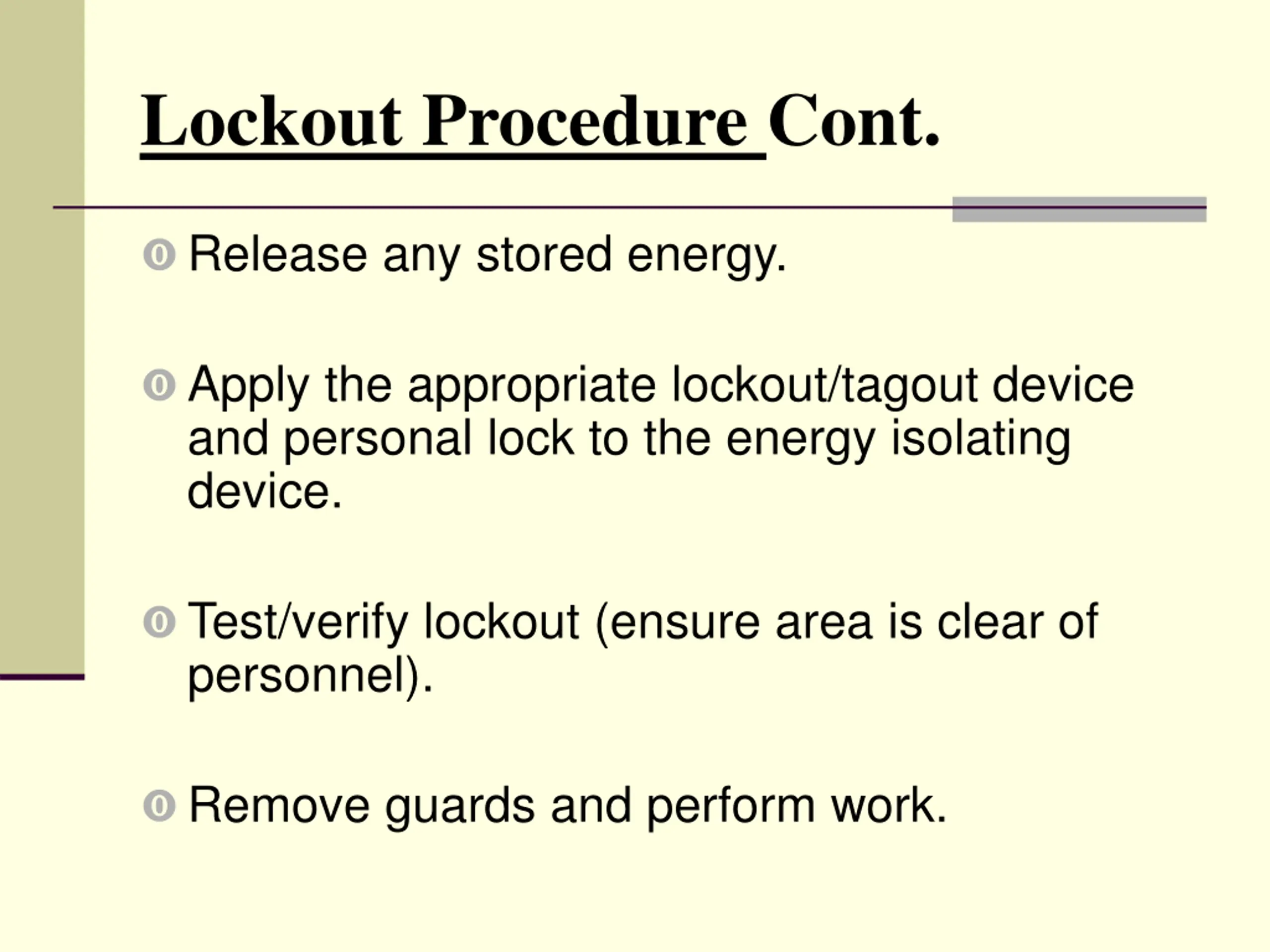 Lockout Procedure Cont. Release any stored energy. Apply the appropriate lockout/tagout device and personal lock to the energy isolating device. Test/verify lockout (ensure area is clear of personnel). Remove guards and perform work.