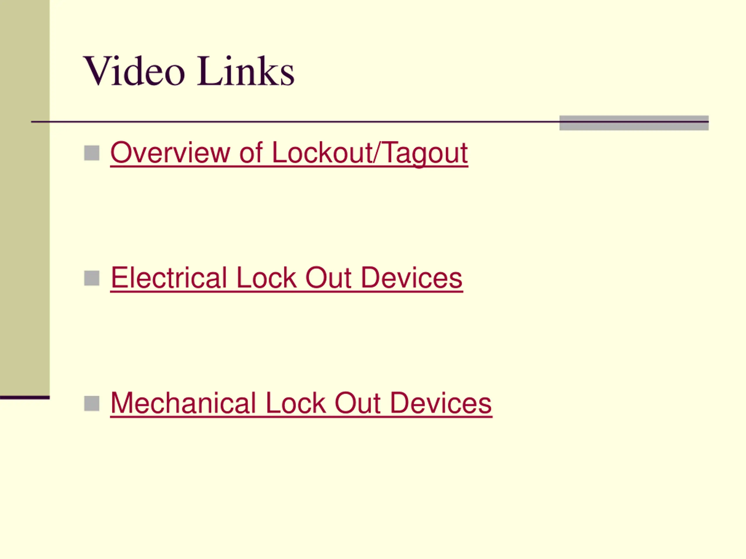 Video Links Overview of Lockout/Tagout Electrical Lock Out Devices Mechanical Lock Out Devices