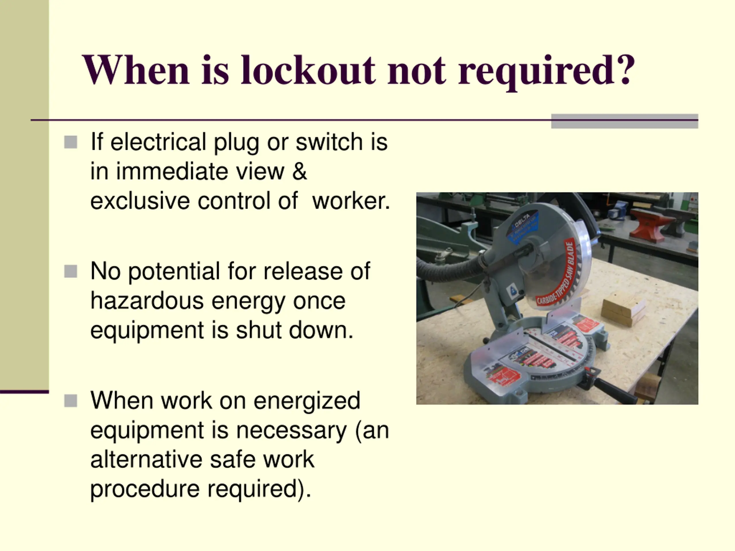 When is lockout not required? If electrical plug or switch is in immediate view & exclusive control of worker. No potential for release of hazardous energy once equipment is shut down. When work on energized equipment is necessary (an alternative safe work procedure required).