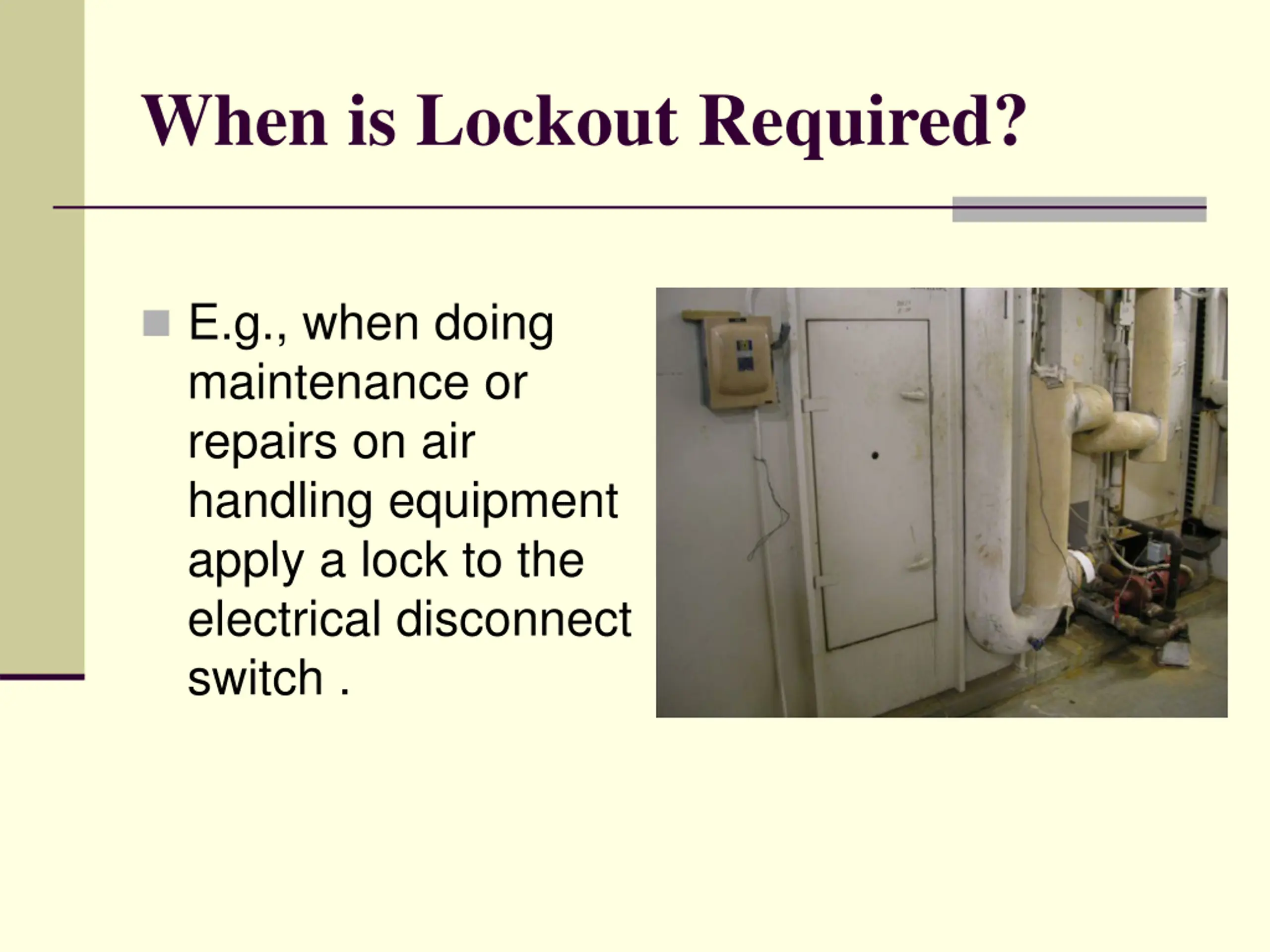 When is Lockout Required? E.g., when doing maintenance or repairs on air handling equipment apply a lock to the electrical disconnect switch .