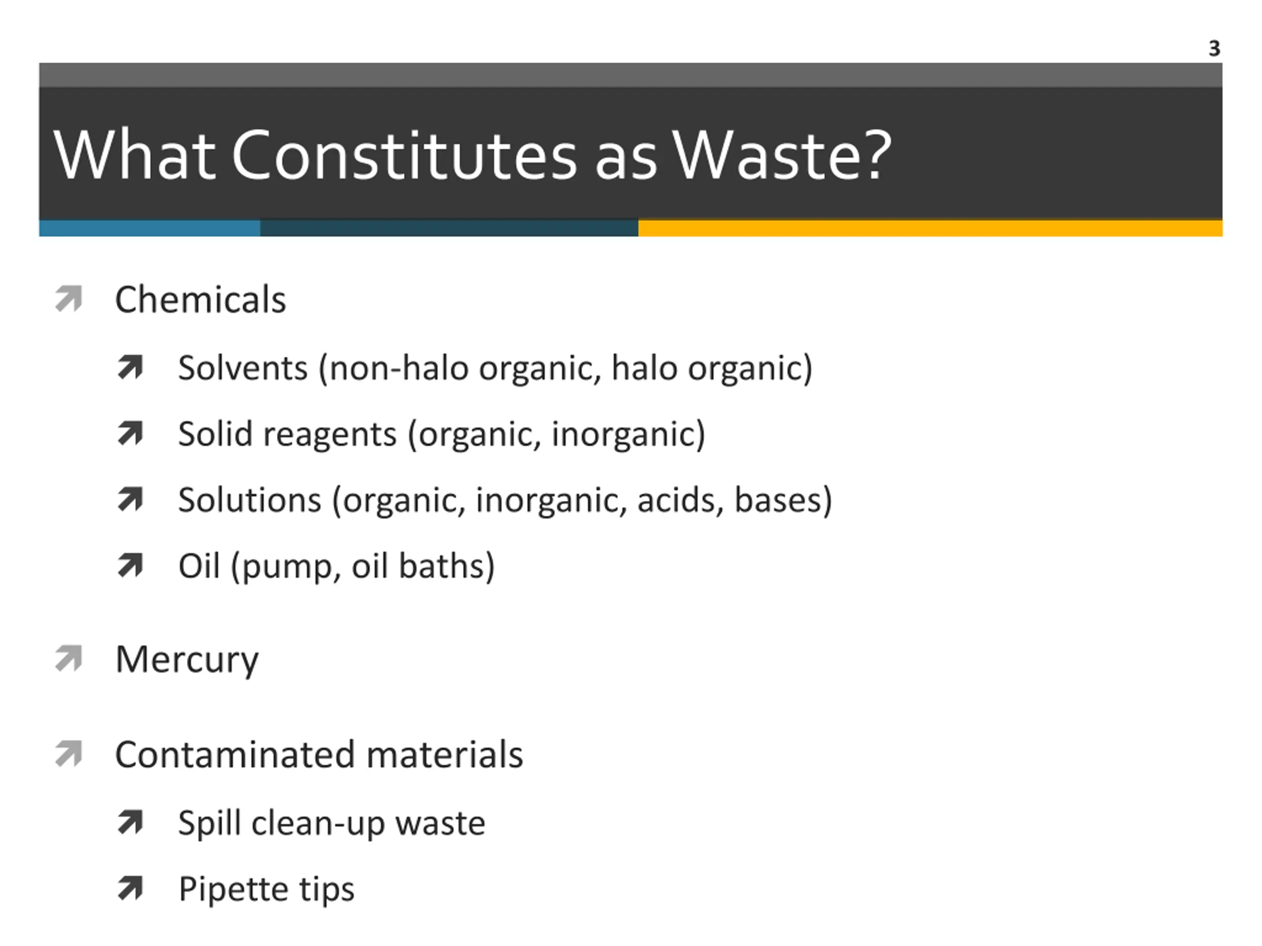 3 What Constitutes as Waste? Chemicals Solvents (non-halo organic, halo organic) Solid reagents (organic, inorganic) Solutions (organic, inorganic, acids, bases) Oil (pump, oil baths) Mercury Contaminated materials Spill clean-up waste Pipette tips