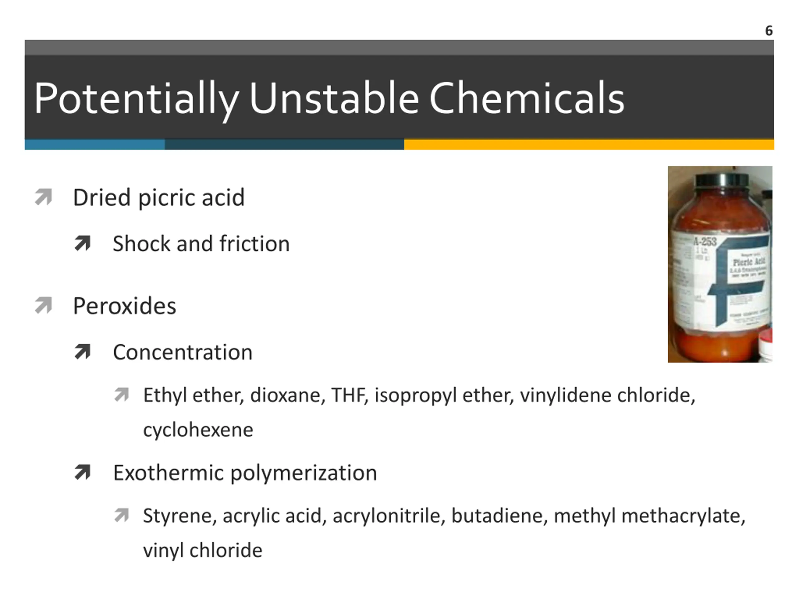 6 Potentially Unstable Chemicals Dried picric acid Shock and friction Peroxides Concentration Ethyl ether, dioxane, THF, isopropyl ether, vinylidene chloride, cyclohexene Exothermic polymerization Styrene, acrylic acid, acrylonitrile, butadiene, methyl methacrylate, vinyl chloride