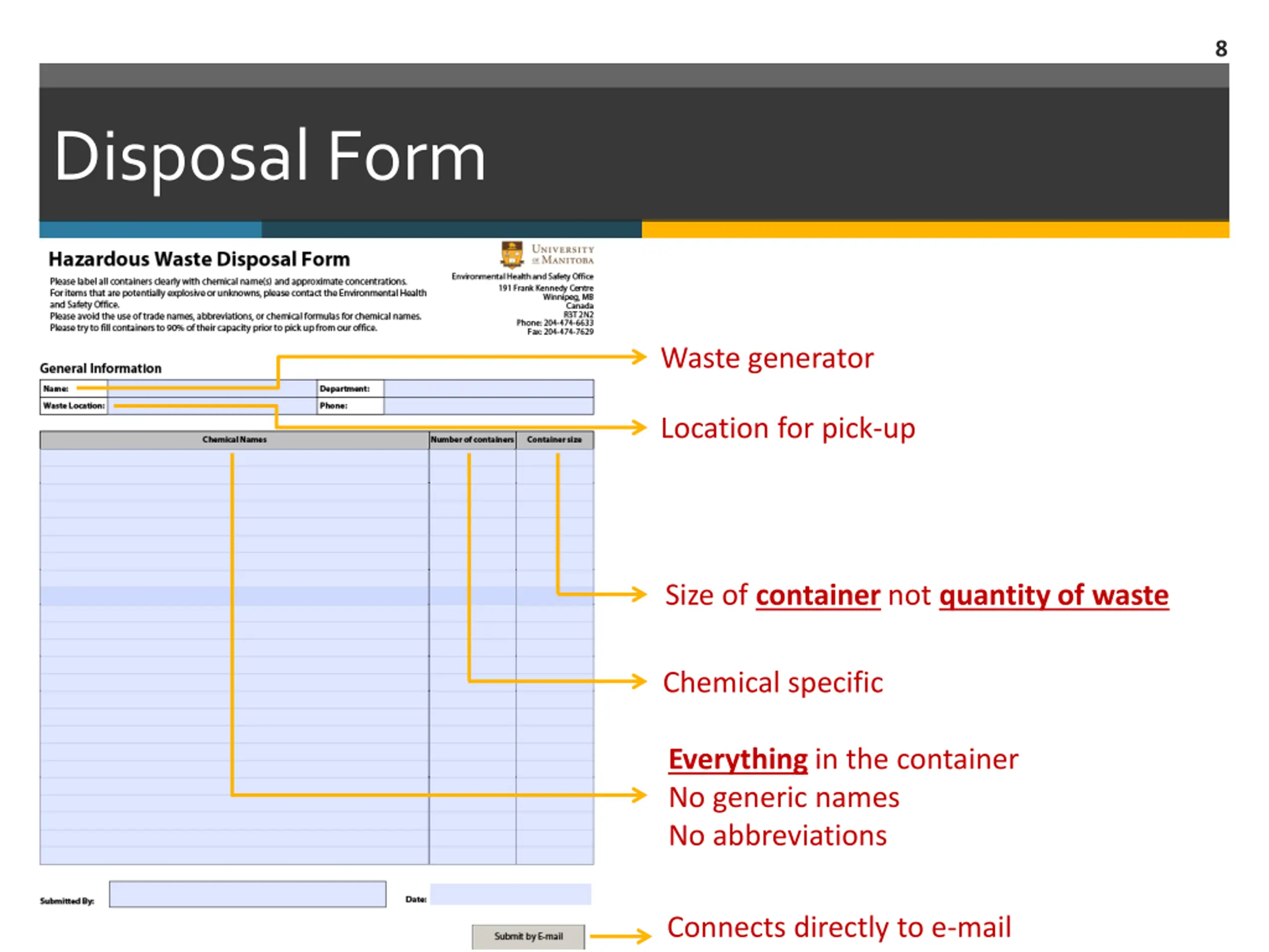 8 Disposal Form Waste generator Location for pick-up Size of container not quantity of waste Chemical specific Everything in the container No generic names No abbreviations Connects directly to e-mail