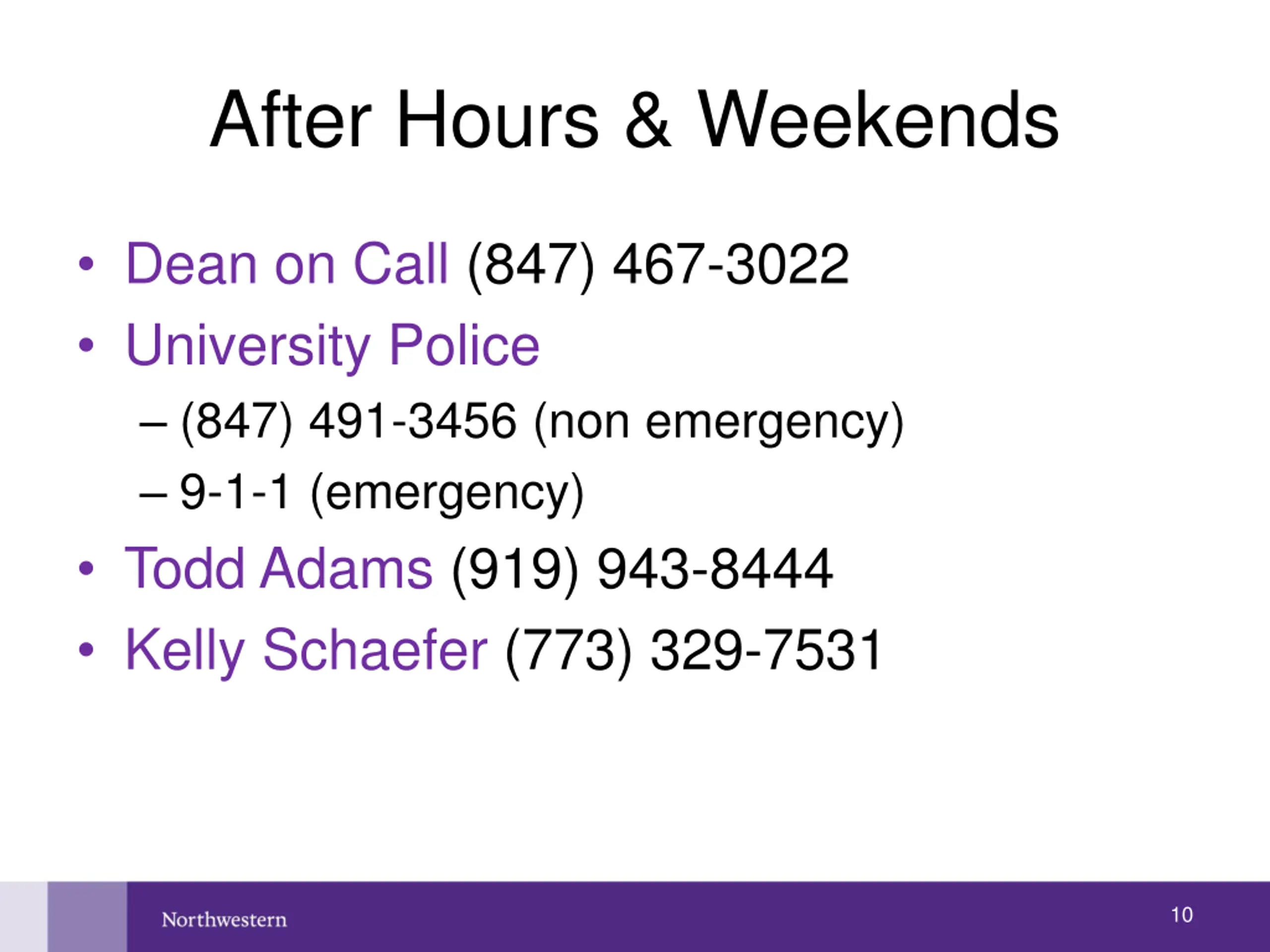 After Hours & Weekends Dean on Call (847) 467-3022 University Police (847) 491-3456 (non emergency) 9-1-1 (emergency) Todd Adams (919) 943-8444 Kelly Schaefer (773) 329-7531 10