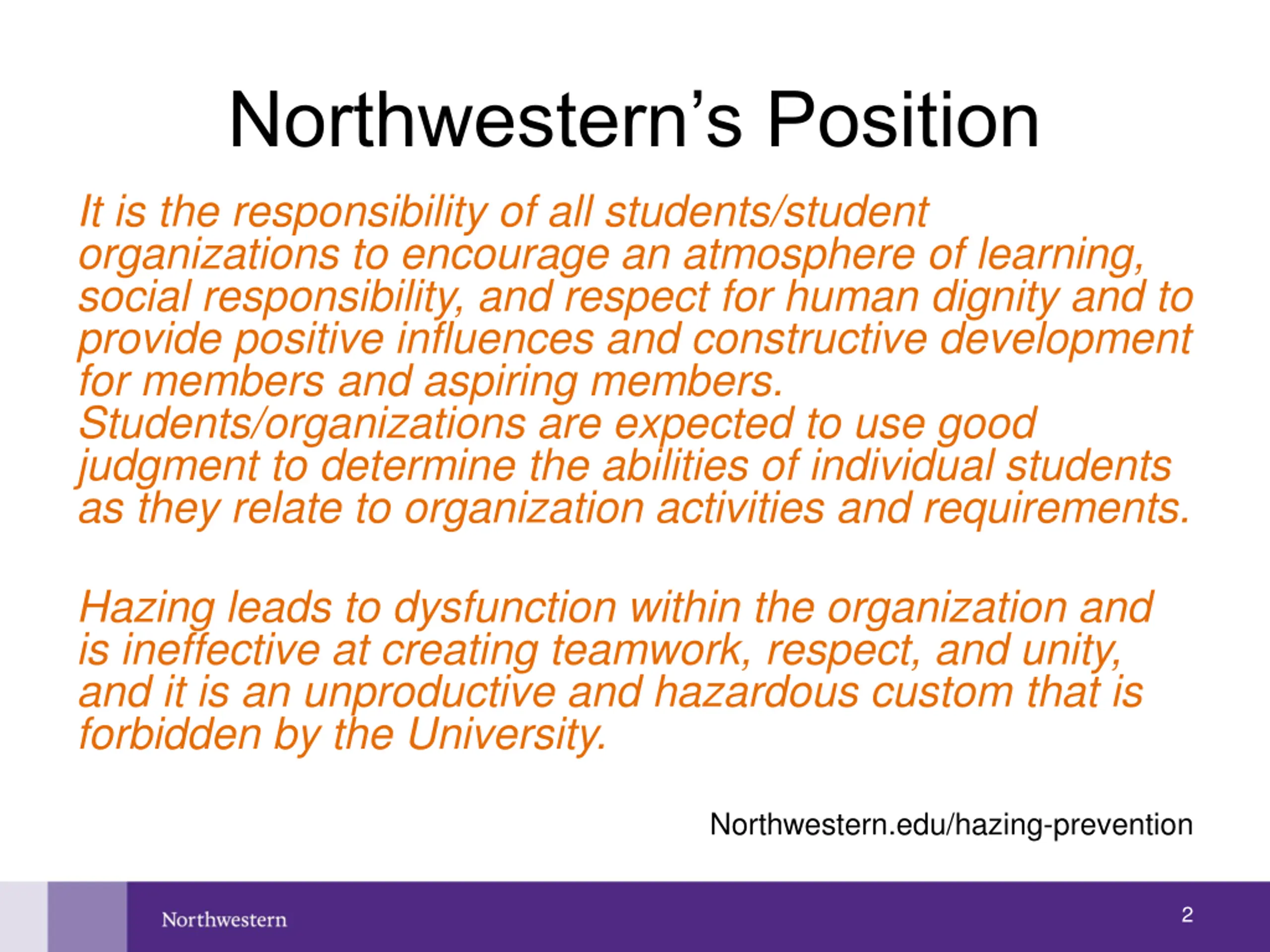 Northwesterns Position It is the responsibility of all students/student organizations to encourage an atmosphere of learning, social responsibility, and respect for human dignity and to provide positive influences and constructive development for members and aspiring members. Students/organizations are expected to use good judgment to determine the abilities of individual students as they relate to organization activities and requirements. Hazing leads to dysfunction within the organization and is ineffective at creating teamwork, respect, and unity, and it is an unproductive and hazardous custom that is forbidden by the University. Northwestern.edu/hazing-prevention 2