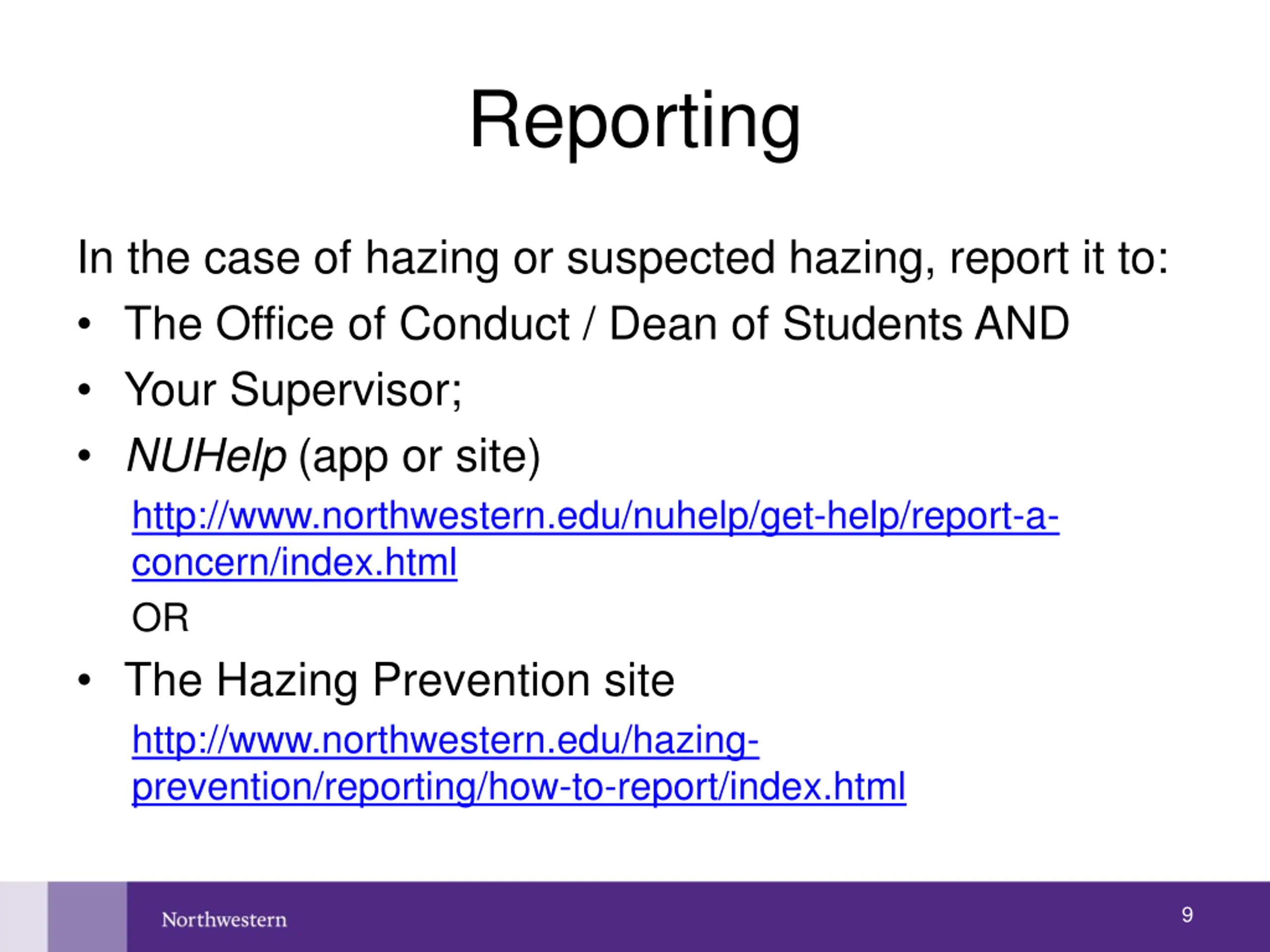 Reporting In the case of hazing or suspected hazing, report it to: The Office of Conduct / Dean of Students AND Your Supervisor; NUHelp (app or site) http://www.northwestern.edu/nuhelp/get-help/report-a- concern/index.html OR The Hazing Prevention site http://www.northwestern.edu/hazing- prevention/reporting/how-to-report/index.html 9