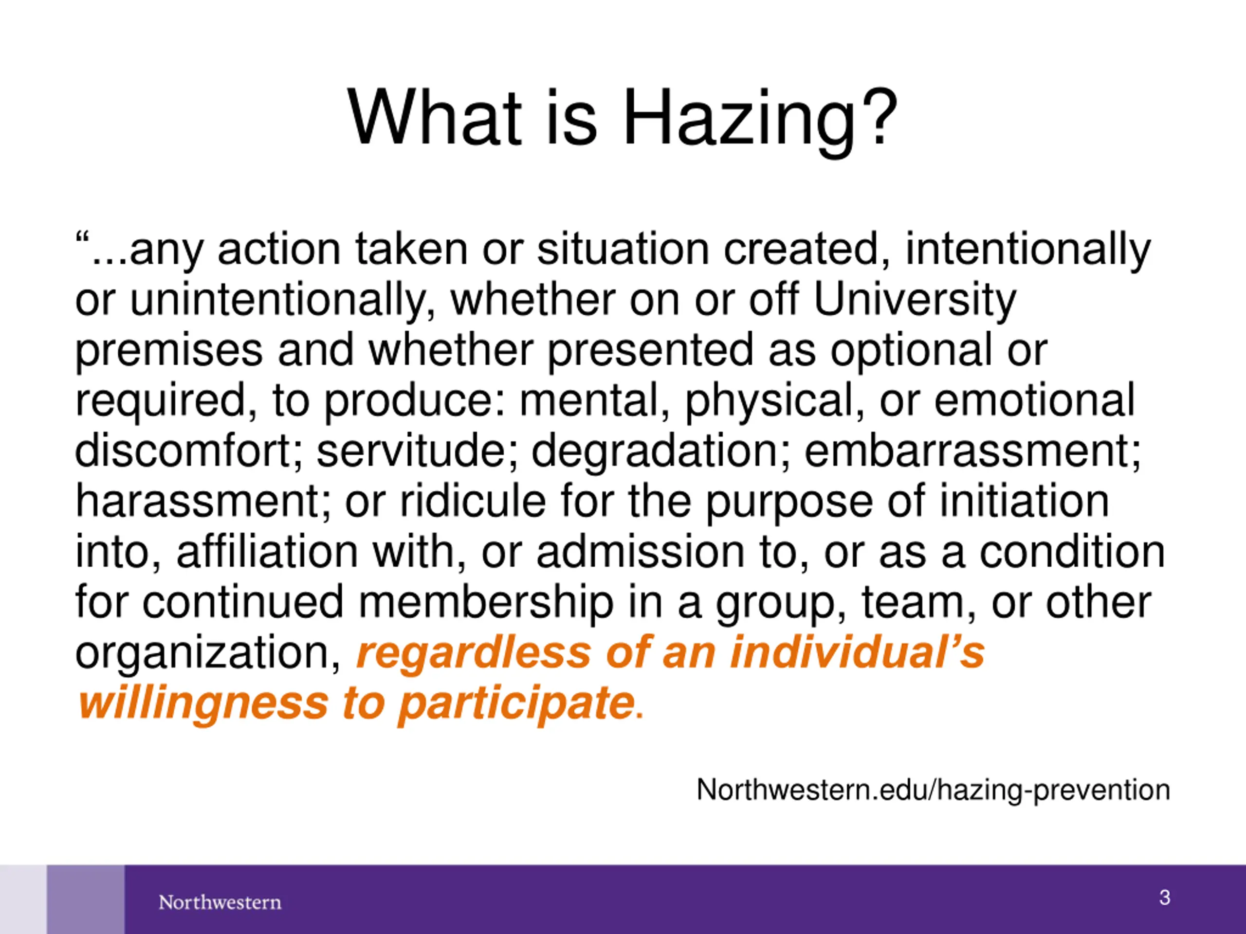 What is Hazing? ...any action taken or situation created, intentionally or unintentionally, whether on or off University premises and whether presented as optional or required, to produce: mental, physical, or emotional discomfort; servitude; degradation; embarrassment; harassment; or ridicule for the purpose of initiation into, affiliation with, or admission to, or as a condition for continued membership in a group, team, or other organization, regardless of an individual s willingness to participate. Northwestern.edu/hazing-prevention 3