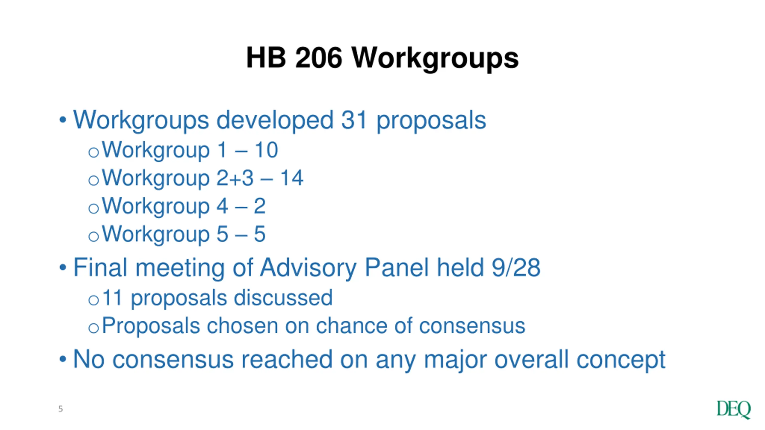 HB 206 Workgroups Workgroups developed 31 proposals oWorkgroup 1 10 oWorkgroup 2+3 14 oWorkgroup 4 2 oWorkgroup 5 5 Final meeting of Advisory Panel held 9/28 o11 proposals discussed oProposals chosen on chance of consensus No consensus reached on any major overall concept 5